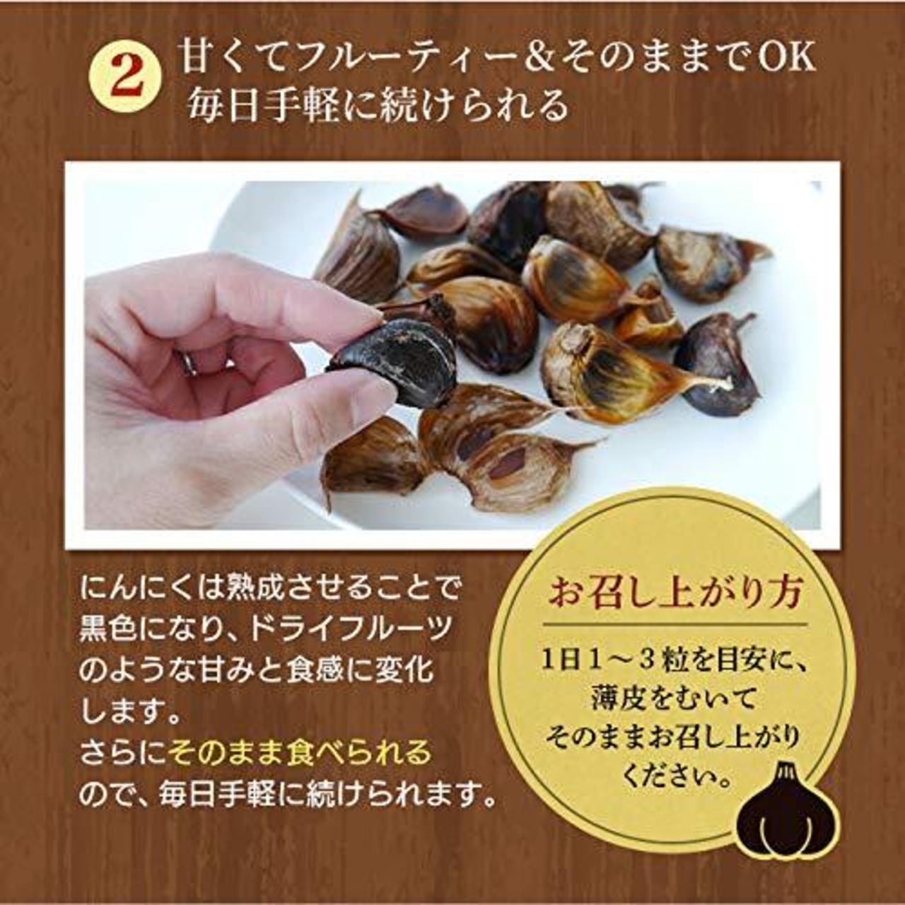【毎日の健康づくりに】1日1~3粒を目安に、薄皮をむいてそのままお召し上がりください。一般的なにんにくに比べてにおいが少なく、食べやすいので手軽に毎日食べ続けられます。ドライフルーツのような食感で食べやすく、お年寄りや子供にもおすすめの逸品です。