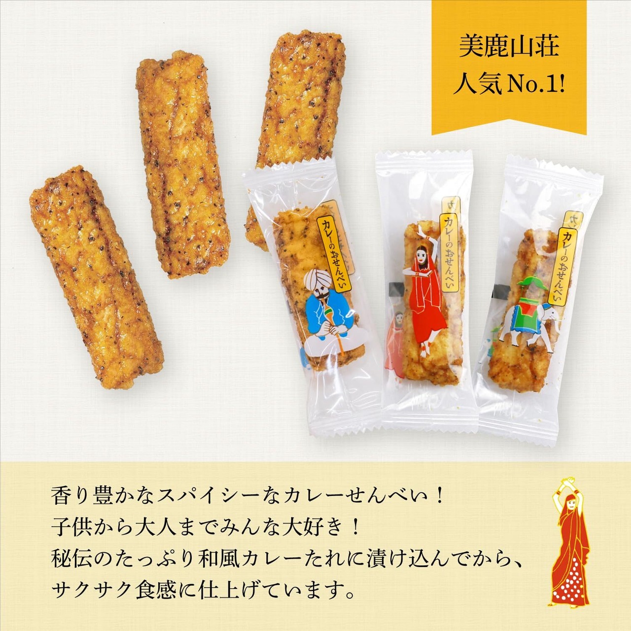美鹿山荘のカレーのおせんべいは、和風風味のカレー味です。ブラックペッパーをピリッと利かしたスパイシーなカレーせんべいはお子様から大人まで大人気の商品です。