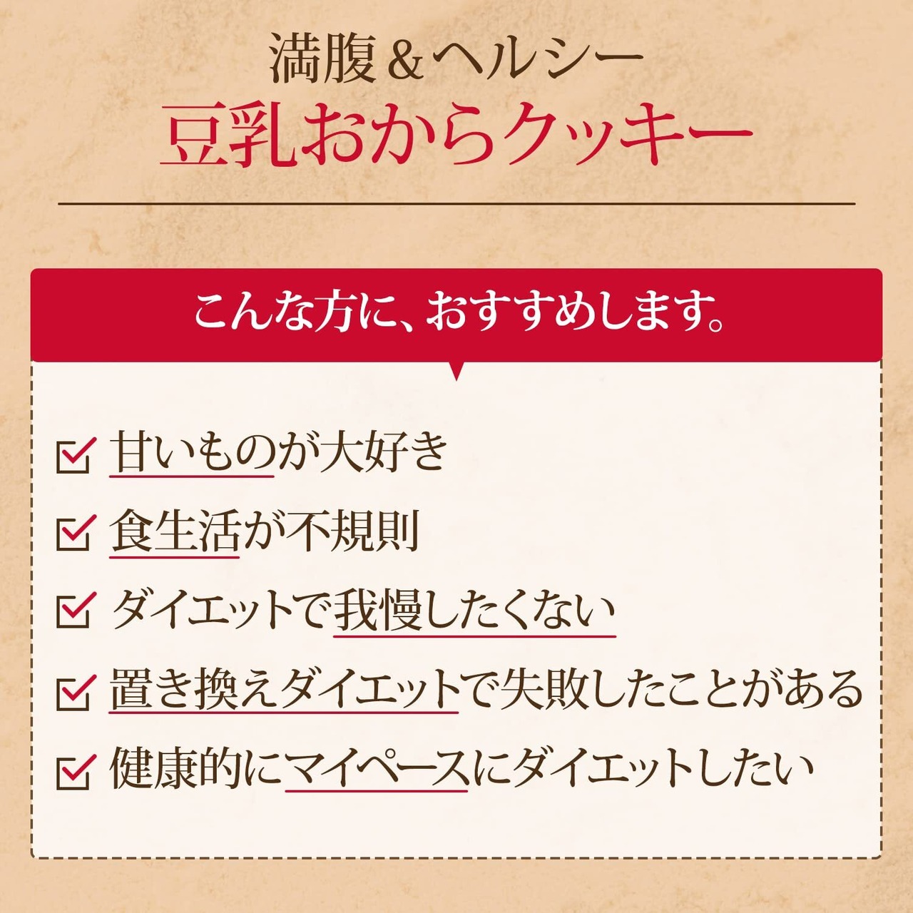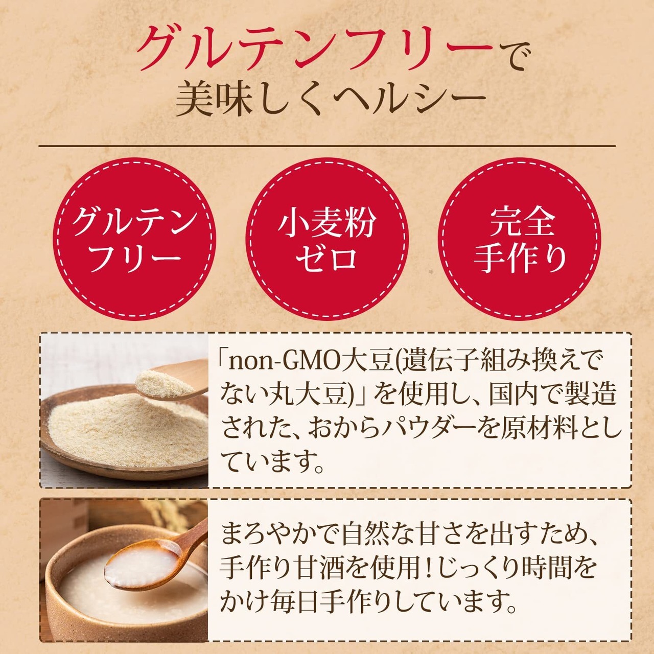 【グルテンフリー】小麦粉を一切使用しておりません。たっぷりの水分と一緒にお召し上がりいただくことで、おからが膨らみ少ない量で満腹感を得ることができます。ダイエット中のおやつにもおすすめ。