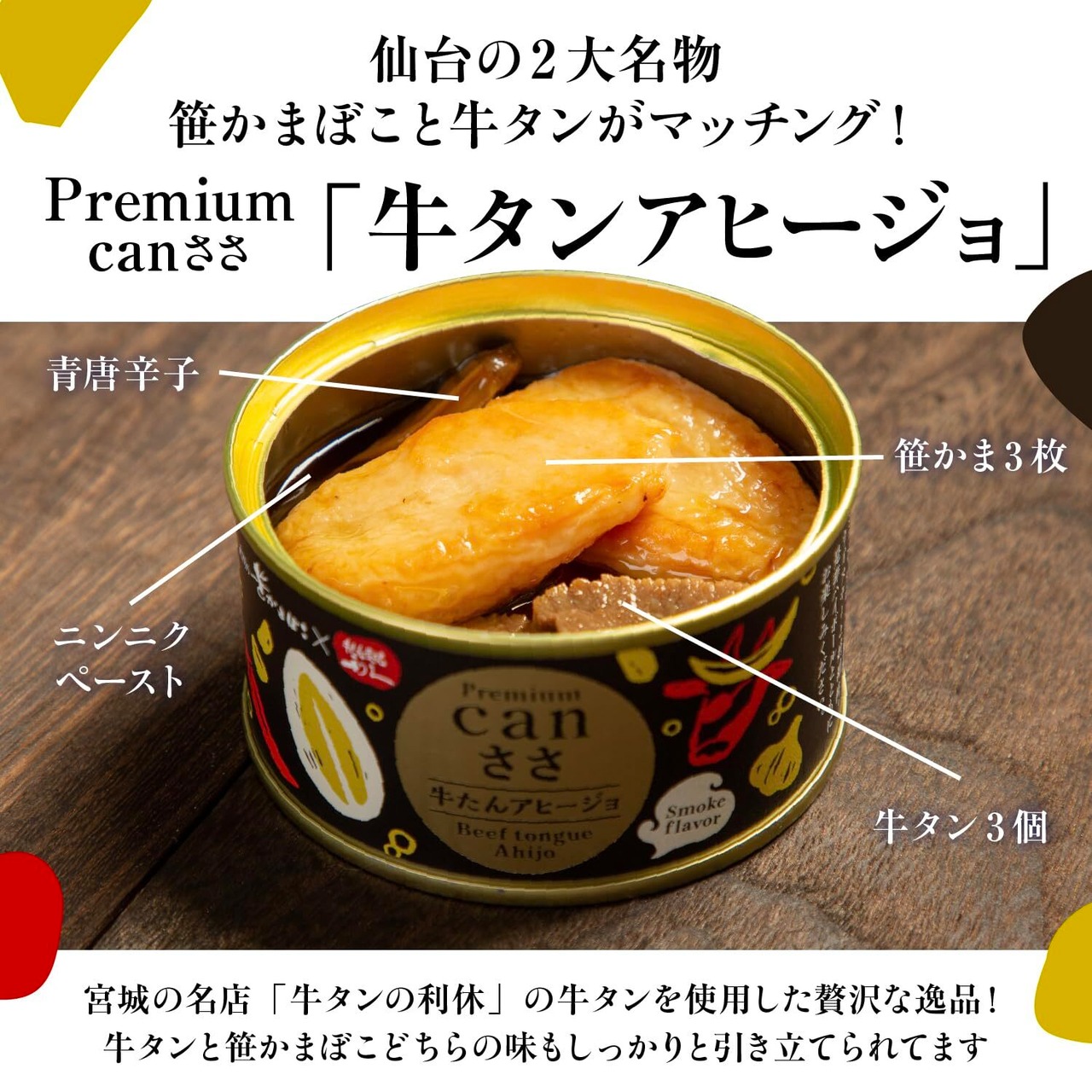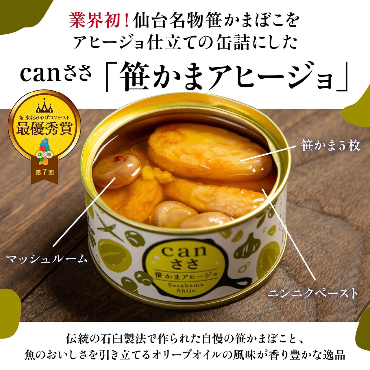 笹かまの缶詰「Can ささ」が登場。塩釜の老舗かまぼこ業者『武田の笹かまぼこ』が開発しミニサイズ笹かまぼこ5枚をニンニクとオリーブオイルが香るアヒージョでいただけます。高級感のあるパッケージデザインと、特別な一品としての価値があり、贈り物としても喜ばれます。特に食の楽しみを共有したい相手にぴったりです。利久様の牛たんが入りニッカウヰスキー様にアドバイスをいただいたプレミアムな逸品。ワインと組み合わせて、新しい笹かまの食べ方を楽しみましょう!