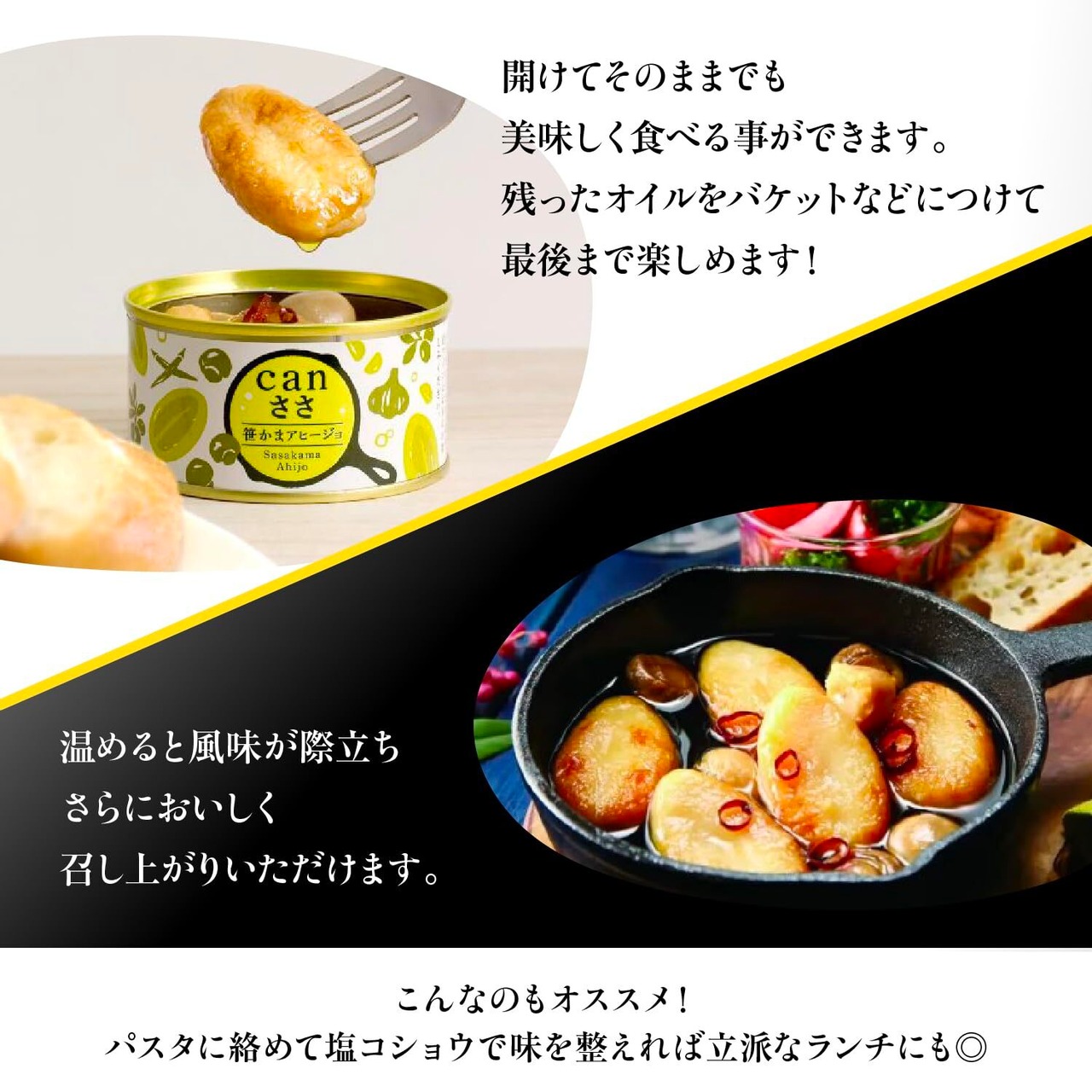 笹かまアヒージョの特徴:缶詰を開けるだけで、プロのシェフが作るような本格的なアヒージョを手軽に楽しめます。忙しい時やキャンプ、アウトドアなどでの利用に最適です。魚肉を主成分とした笹かまぼこは、低脂肪で高タンパク質。そのまま食べても美味しいですが、パンに乗せたり、サラダのトッピングに使ったりするなど、アレンジが自在です。