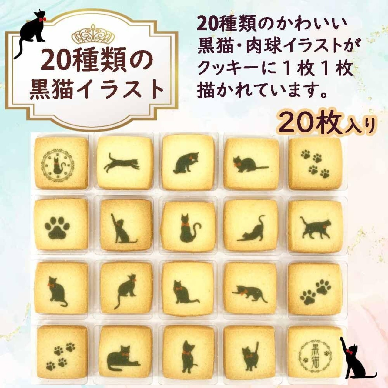 レトロでモダンな20種類のかわいい黒猫や肉球のイラストが、 クッキーに1枚1枚描かれたとっても可愛いクッキーです。