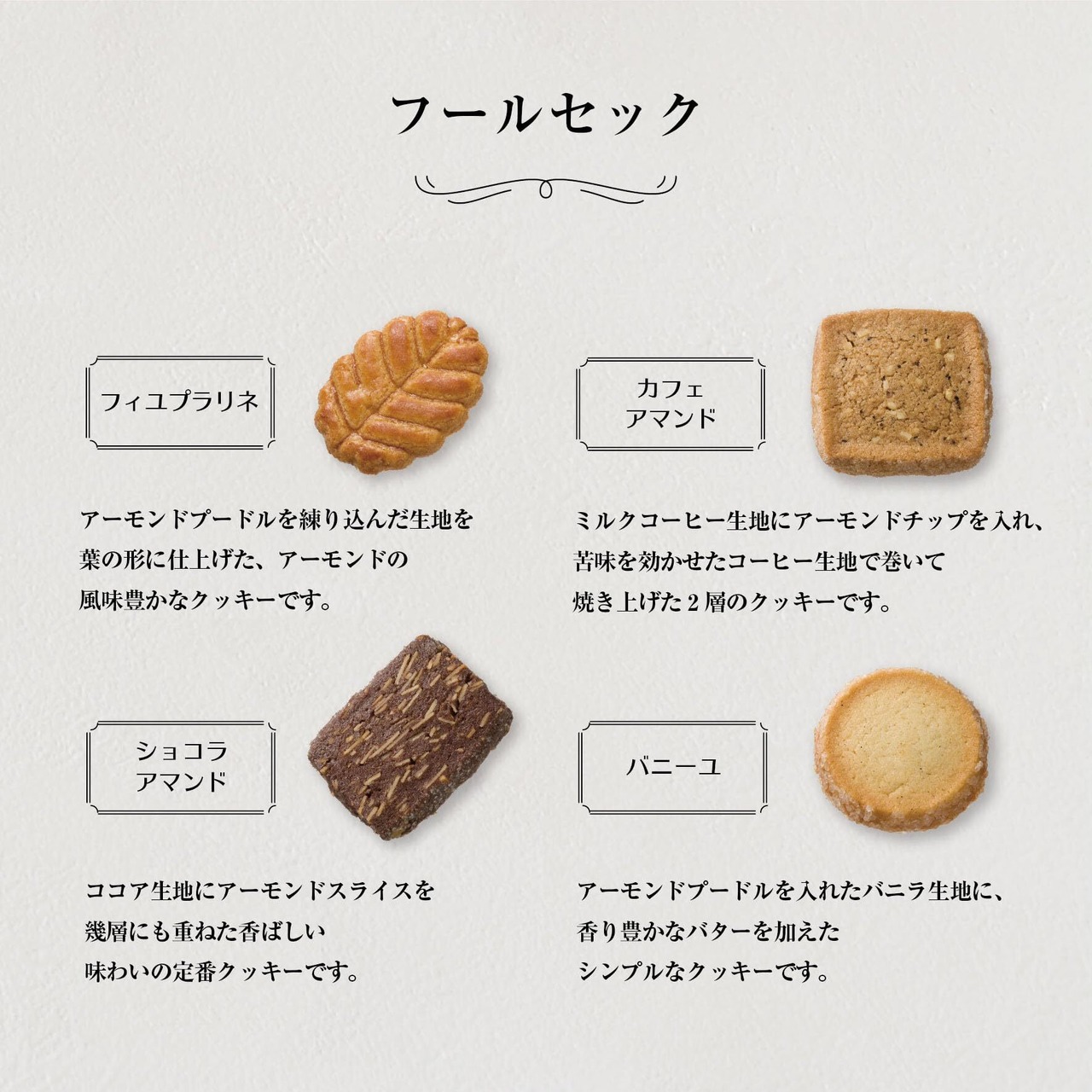 流行に左右されない味、シンプルさを追求し、素材にこだわった贅沢な焼菓子です。パルミジャーノレジャーノ:イタリアチーズのパルミジャーノレジャーノを使用して焼き上げた軽い塩味のクッキーです。アマンド:プラリネ粉末とローストしたアーモンドのペーストを練り込んだ生地に、アーモンドチップを加えて焼き上げたクッキーです。フランボワーズ:バニラ味のクッキーに、ほのかな酸味のラズベリージャムをコーティングしたソフトクッキーです。カフェアマンド:ミルクコーヒー生地にアーモンドチップを入れ、苦味を効かせたコーヒー生地で巻いて焼き上げた2層のクッキーです。ピスタチオ:ピスタチオ生地に刻みピスタチオを入れて、上下をパイ生地でサンドして焼き上げた色鮮やかなクッキーです。フィユプラリネ:アーモンドプードルを練り込んだ生地を葉の形に仕上げたアーモンドの風味豊かなクッキーです。バニーユ:アーモンドプードルを入れたバニラ生地に、香り豊かなバターを加えたシンプルなクッキーです。ショコラアマンド:ココア生地にアーモンドスライスを幾層にも重ねた、香ばしい味わいの定番クッキーです。