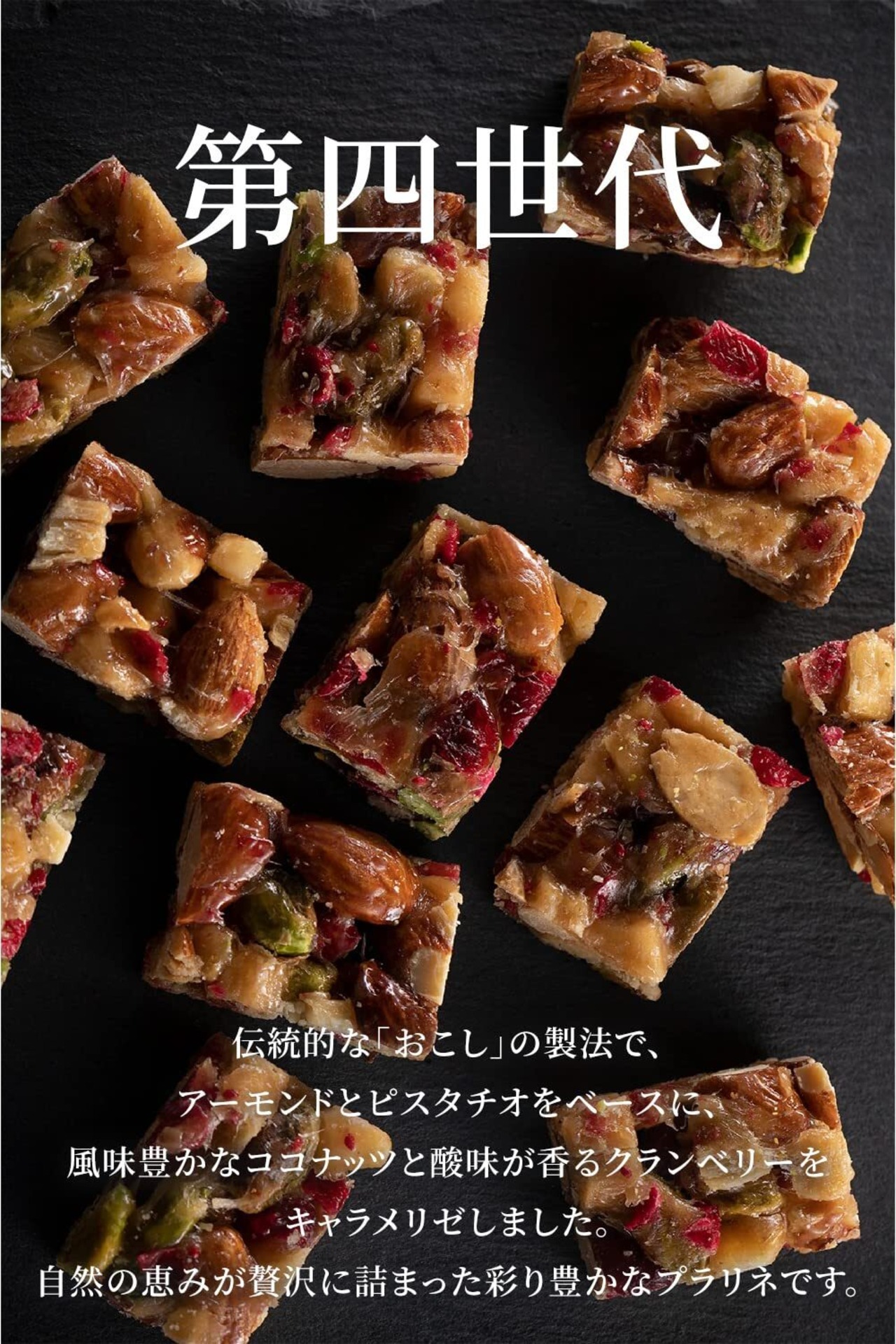 ・原材料名:アーモンド(アメリカ)、水飴、ローストココナッツ(ココナッツ、砂糖、食塩)、ピスタチオ、食用植物油脂、乾燥クランベリー(クランベリー、砂糖)、砂糖、キャラメルシーズニング(乳成分を含む)/香料、甘味料(スクラロース)