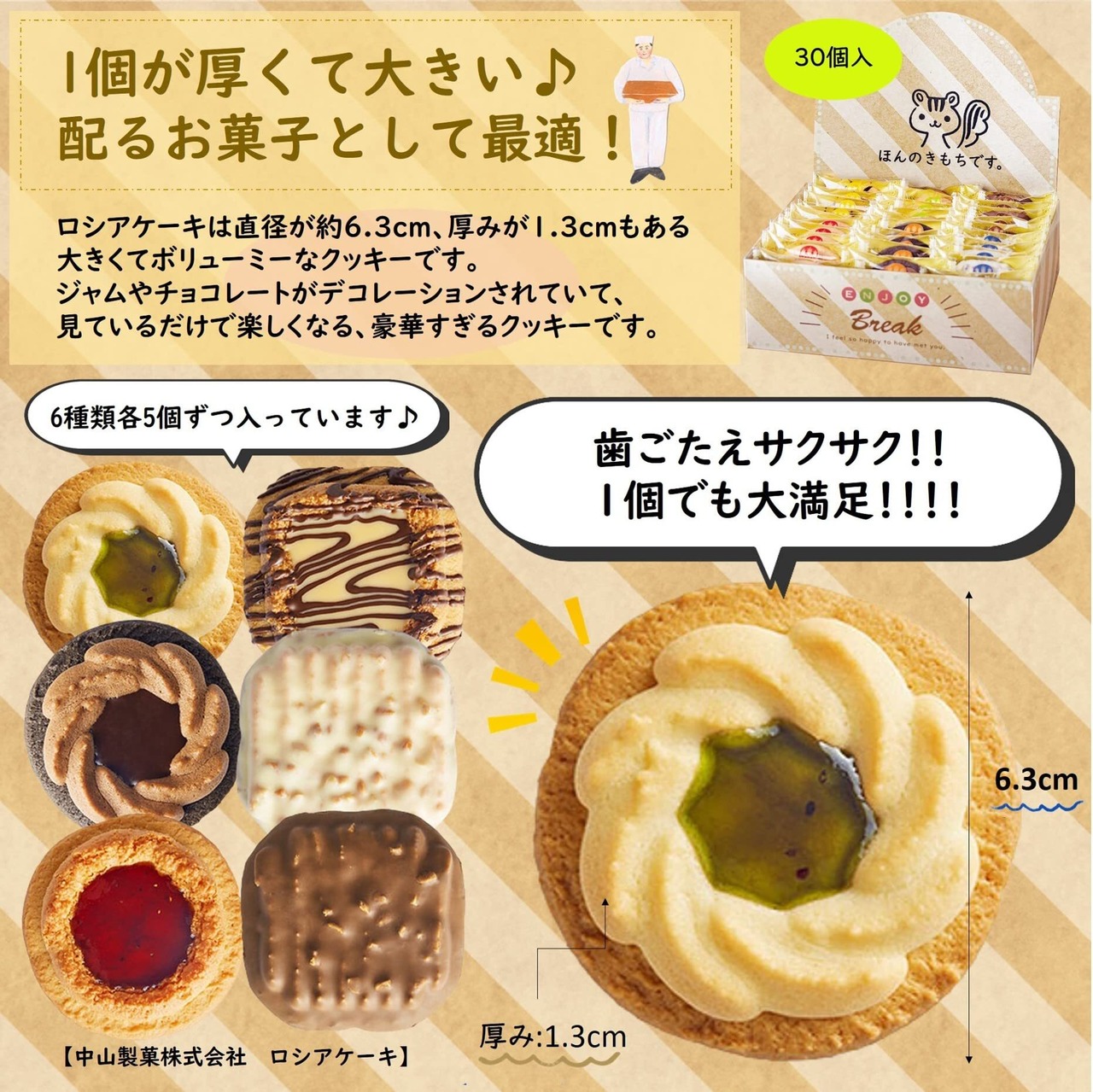 中山製菓のロシアクッキーが6種類各5個、合計30個入っています。