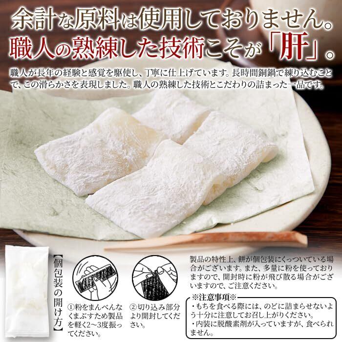 【余計な原料は使用しておりません。】お口に含めばふわりととろけ、ほんのりともち米の優しい甘さが広がる。北陸産のもち米を使用した羽二重餅をお楽しみください。