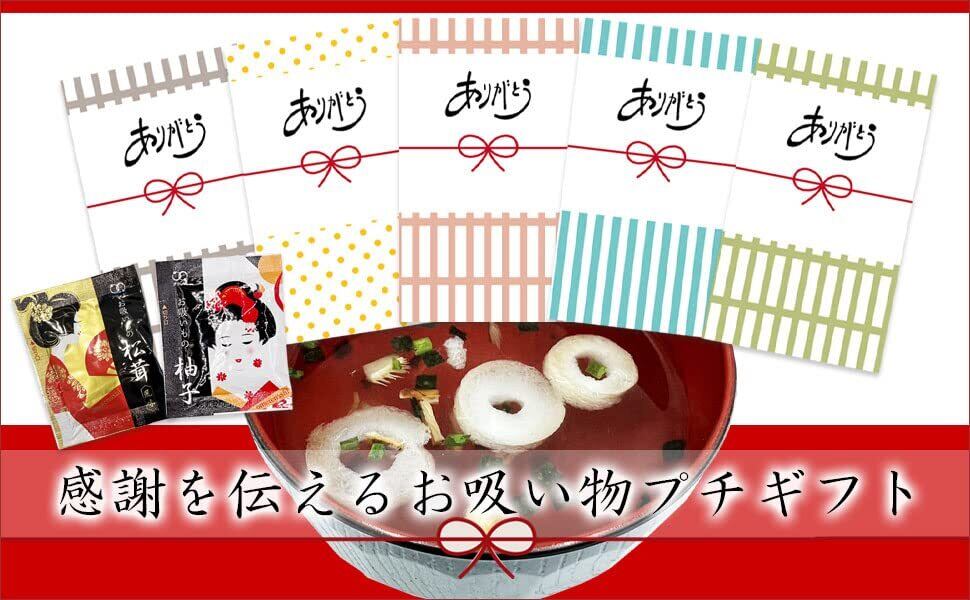 プチギフト用にパッケージしたお吸い物のギフト個包装済20袋セットです。 すぐに渡せるギフト梱包済です。心ばかりの贈り物としてお使いいただけます。 女性・男性、年齢を問わず渡しやすいお吸い物のセットです。 パッケージ内容:(お吸い物2種類)×20セット ギフト梱包済 2種類のお吸い物「松茸 柚子風味」が2袋づつ入っておりますランダムセットとなります。味や包装の種類は選べません。