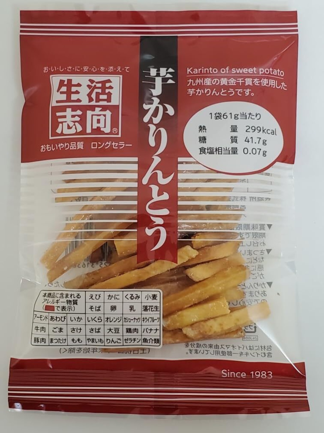 1袋(61g)当たり 熱量299Kcal、たんぱく質0.9g、脂 質13.9g、炭水化物43.5g、-糖質41.7g、-食物繊維1.8gナトリウム0mg、食塩相当量0.07g、カルシウム0