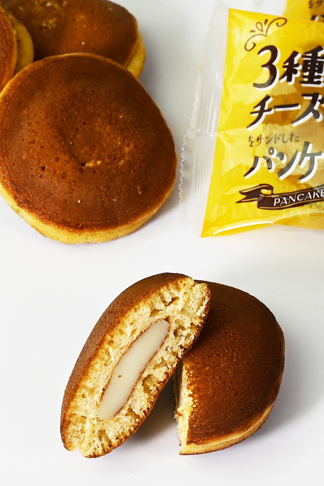 【3種類のチーズクリームをミックスしたミニパンケーキ】クリームチーズ・チェダーチーズ・ゴーダチーズの3種類をミックスしたチーズクリームをサンドにしたどら焼き形状の和菓子です!業務用サイズの大容量なので、ちょっとした差し入れや自宅でパーティーを開くときのお菓子などにもピッタリの和菓子です。