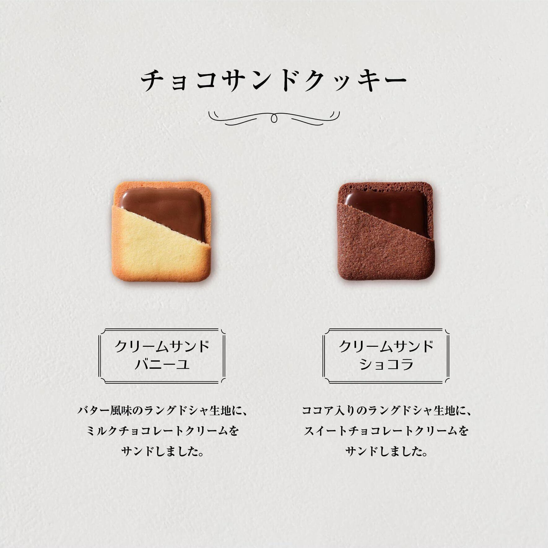 サクッと軽いラングドシャ生地にチョコレートクリームをサンドした定番クッキーです。 〇クリームサンドショコラ:ココア入りラングドシャ生地に、オリジナルのスイートチョコレートクリームをサンドしたクッキーです。〇クリームサンドバニーユ:バター風味のラングドシャ生地に、オリジナルのミルクチョコレートクリームをサンドしたクッキーです。(注)「が発送」の場合、【包装紙なし】【手提げ袋なし】になります。