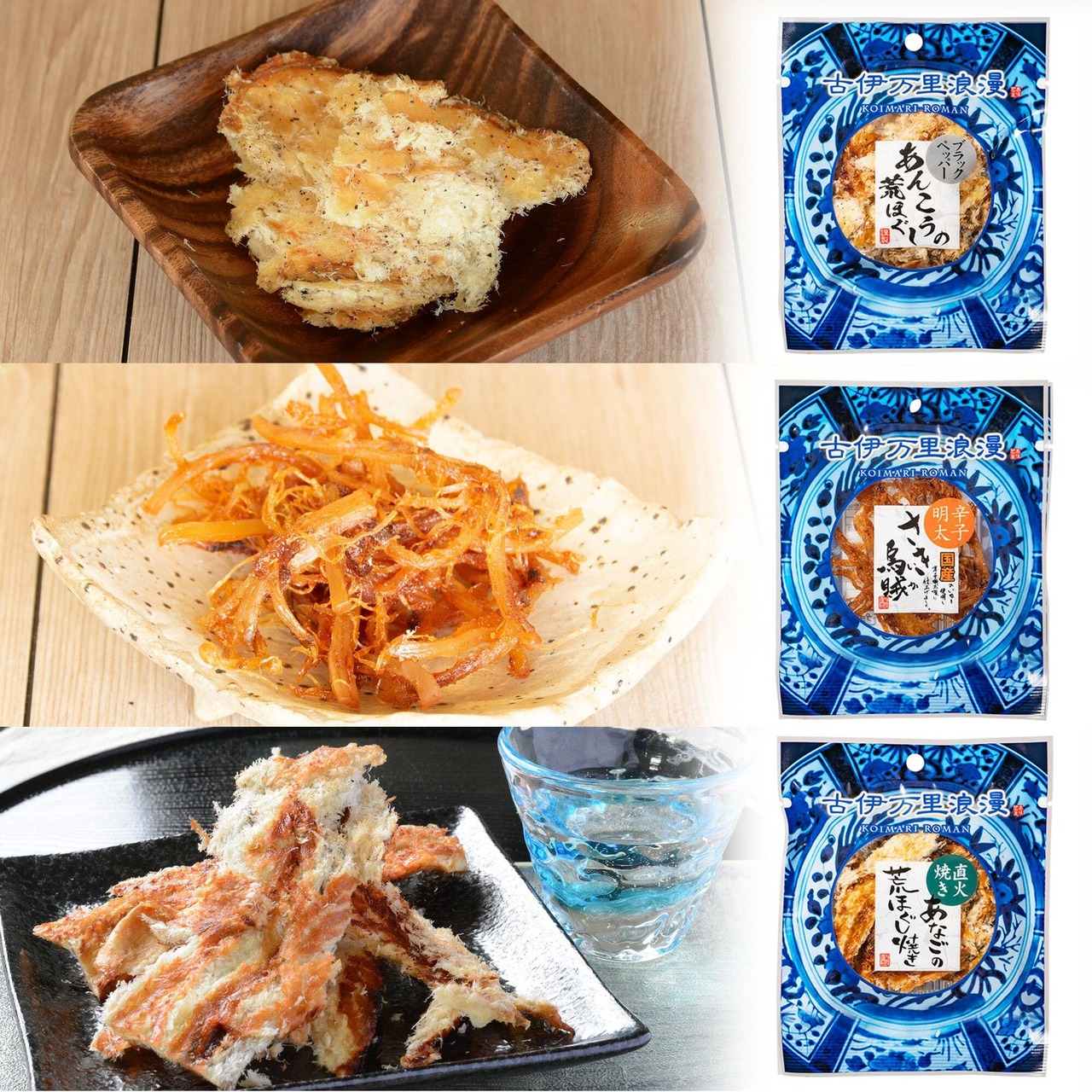 商品内容:殿様するめ15g・辛子明太さきいか17g・つまみあご23g・焼えび17g・炙りいわし23g・ブラックペッパーあんこうの荒ほぐし17g・きすのほぐし焼き16g・鯛の醤油焼22g・あなごの荒ほぐし焼き16g