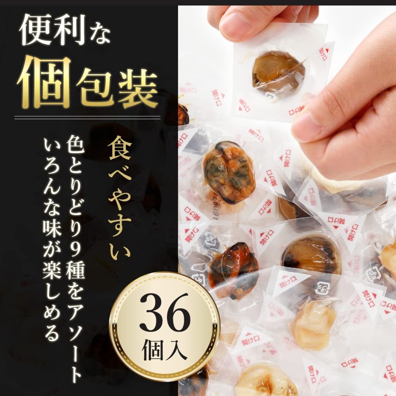 あわびステーキ / 帆立 / つぶ貝 / 貝柱 / ムール貝 / チーズ貝柱 / チーズムール貝 / うずらの煮たまご / 焼きとり 9種×各4包 合計36包入