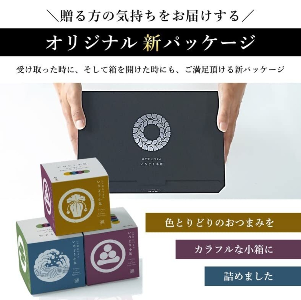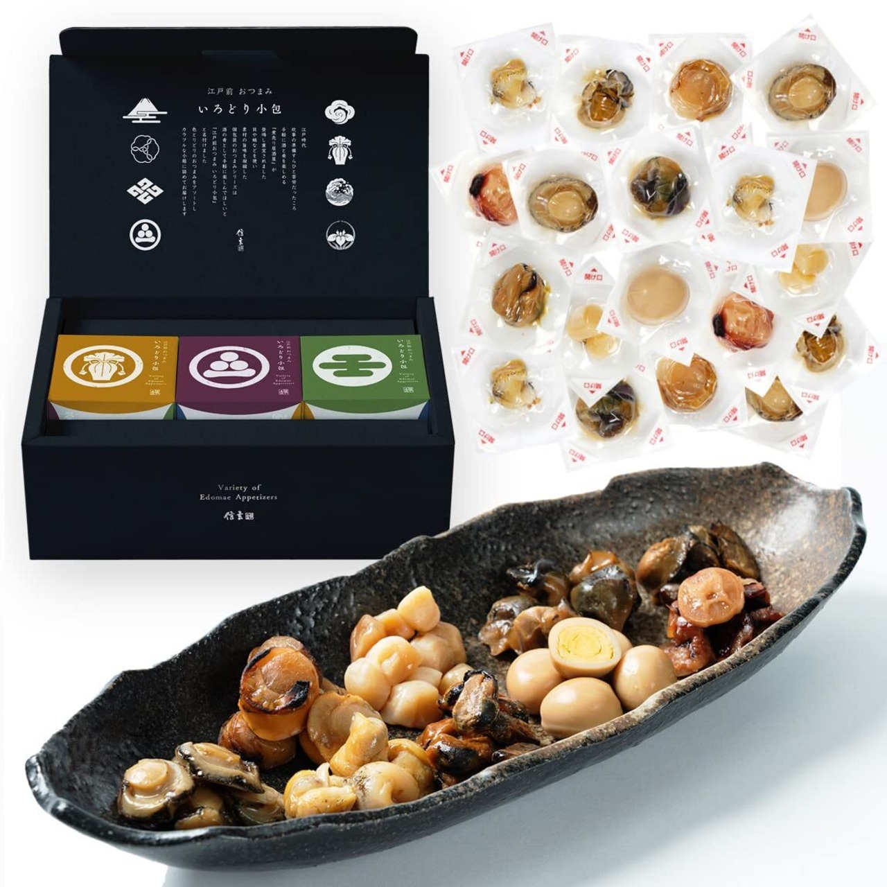 江戸前おつまみ < いろどり小包 > は 乾燥させることで旨味を凝縮した 高級おつまみギフト です。 ビール / ワイン / 日本酒 / 焼酎 など 酒の肴 に。