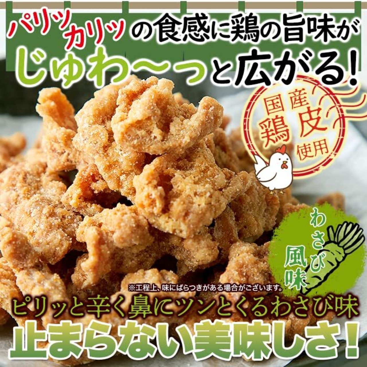 【国産の鶏皮使用!!】国産鶏皮に米粉をまぶして揚げたカリカリの食感がたまらない逸品です。口に入れた瞬間に爽やかなわさびの香りが口いっぱいに広がりクセになるおつまみです!!