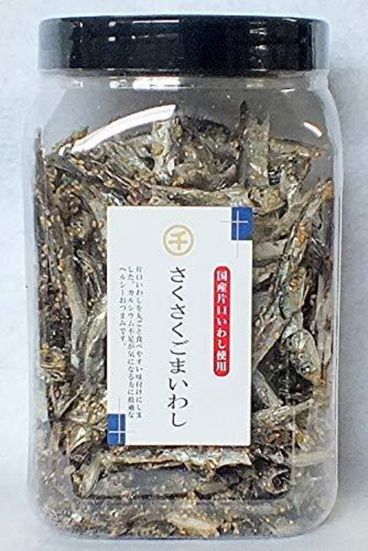 【サクサク食感と懐かしの味わい】国産の片口いわしにゴマをまぶし、お子様からお年寄りまでみんなが大好きな、醤油と砂糖の甘辛味に仕上げました。いわしとゴマの香ばしくほろ苦い旨味はどこか懐かしく飽きない味わい。薄焼きいわしせんべいがお好きな方にも楽しんで頂けるサクサク食感です