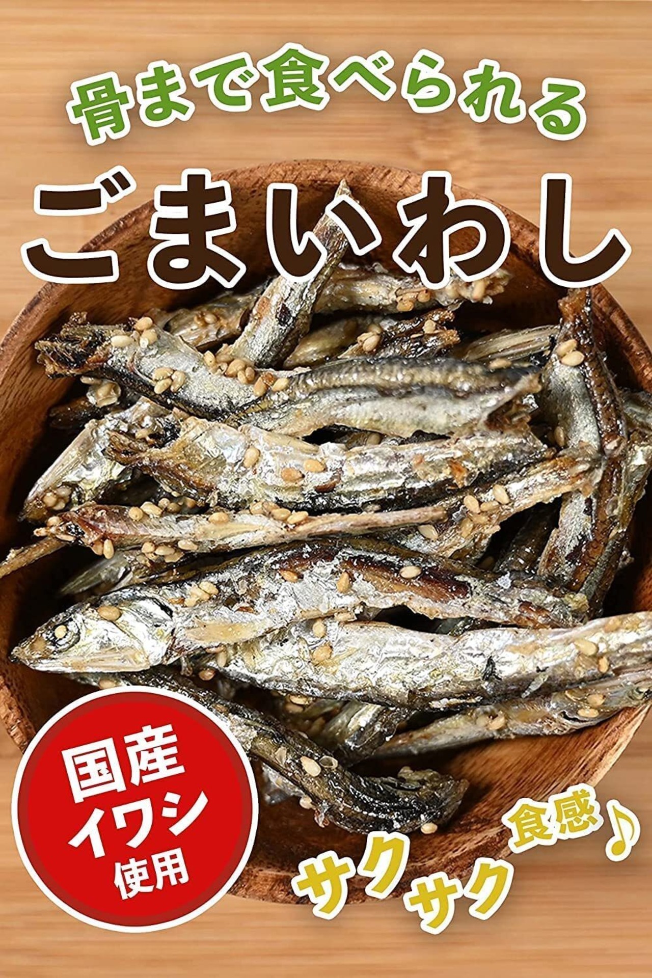 【国産にぼしとゴマの健康おやつ】大きめの国産片口いわし(にぼし)を少し甘めに味付けし、香ばしいゴマを振りかけました。サクサク食感で、いわしの旨味と少し甘く、ほろ苦い味がくせになるおやつ・珍味です。煮干し小魚をそのまま骨ごと食べられるので健康を考える方におすすめです!
