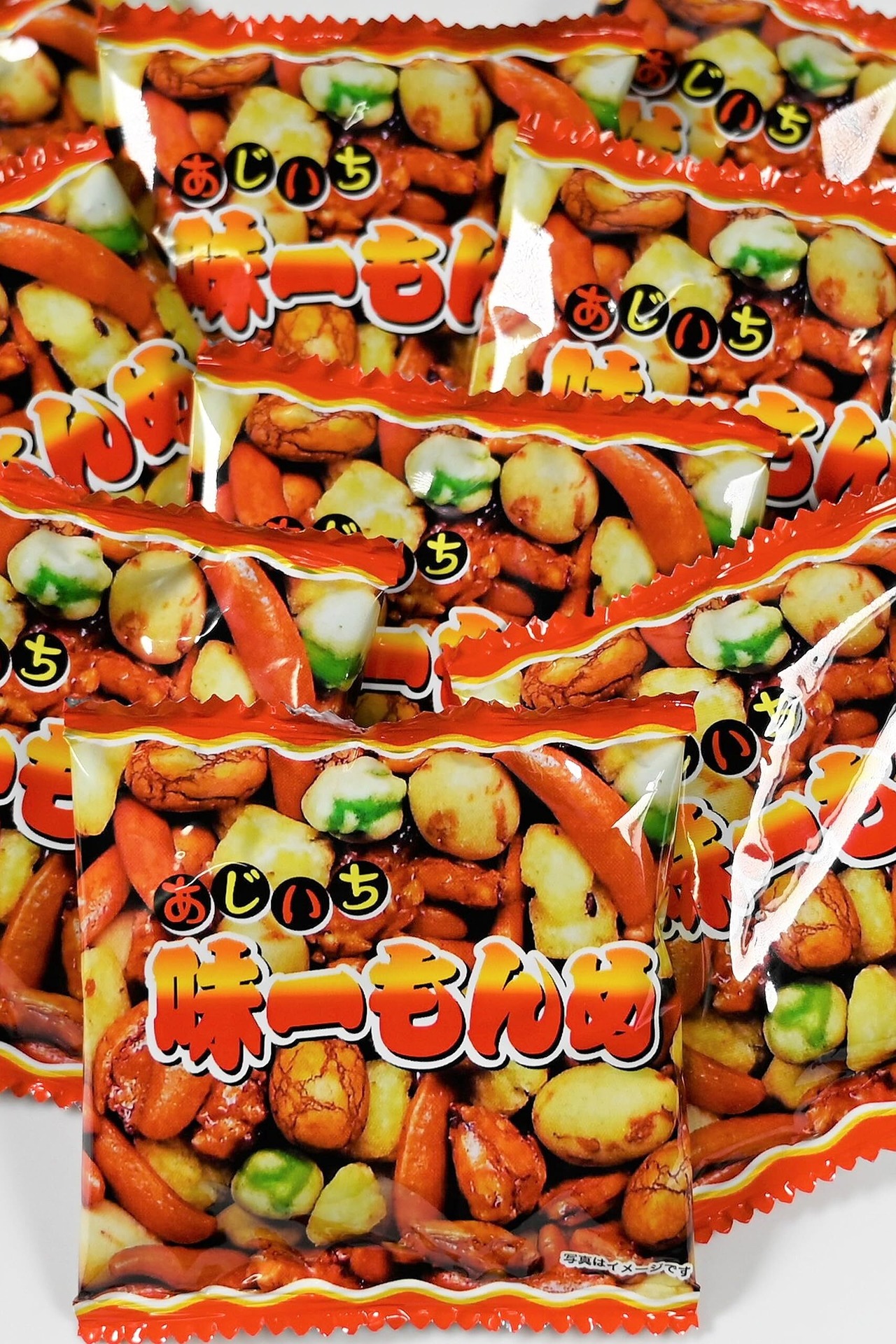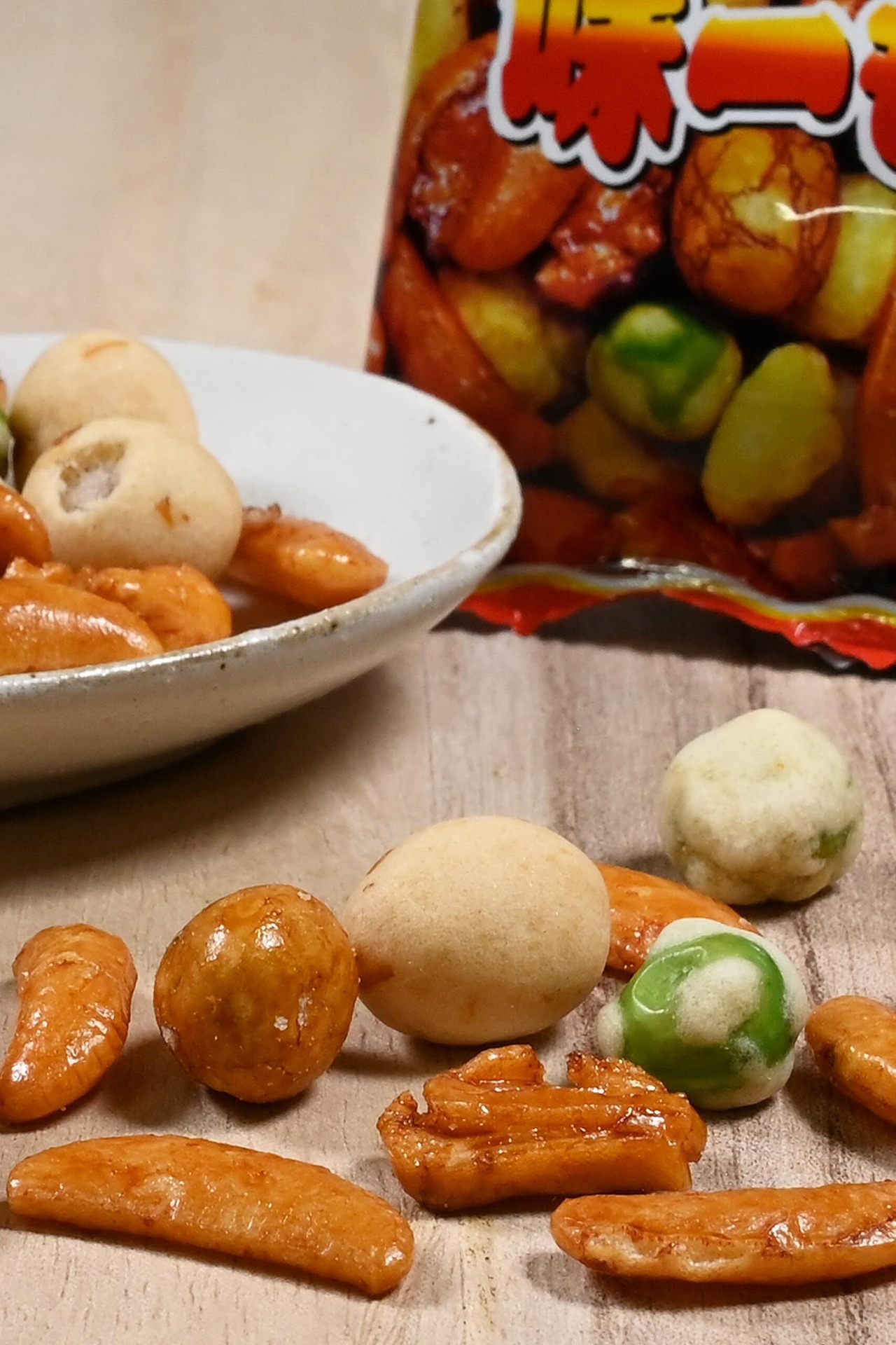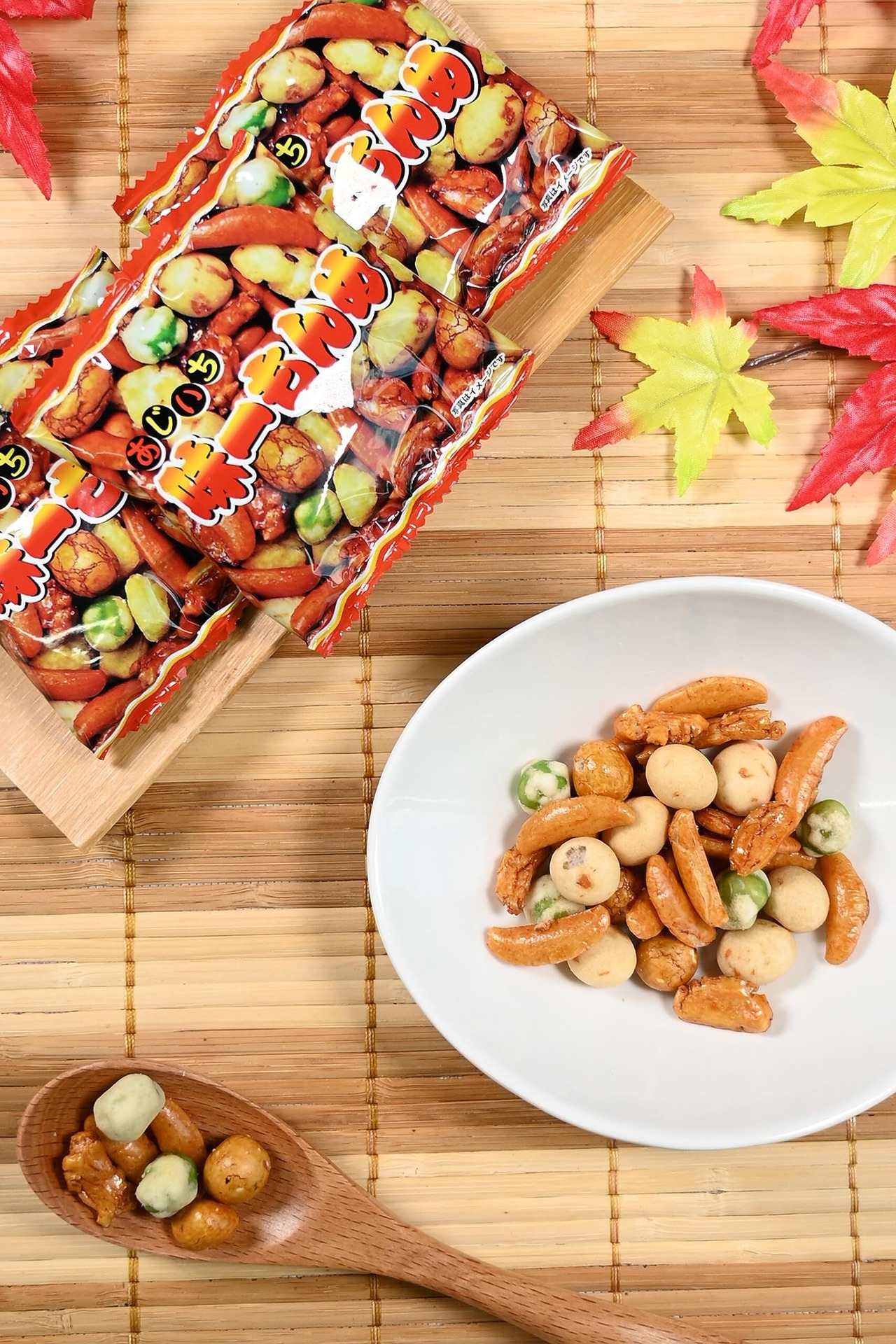 内容:画像5枚目 いかピー ピーナッツにまわりにいかを練り込んだ衣がついたさくさくの食感のナッツ。 画像6枚目 醤油豆 ピーナッツの周りに衣をつけ醤油味にし海苔をつけた和風の味わいです。 画像7枚目 つぶ餅 国産米をあられにし甘辛い醤油味になってます。 画像8枚目 ピー揚げ クラッシュピーナッツとあられを揚げた軽い食感のあられです。画像9枚目 グリーンスナックと柿の種 エンドウ豆をカリッと揚げたものといわずとしれた柿の種です。