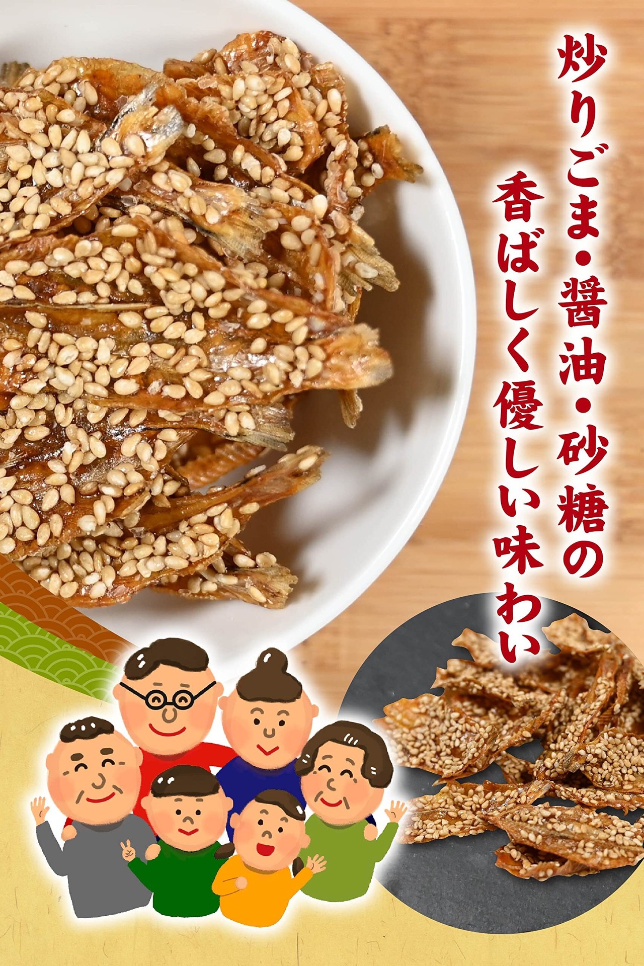 【おやつ・おつまみに活躍!】懐かしく食べやすい優しい味付けにしました。炒りごま・醤油・砂糖を使った香ばしい風味は世代を問わず食べやすい味付けです。お子様のおやつに、ビールや日本酒などのお酒のおつまみなどに幅広くお楽しみいただけます。