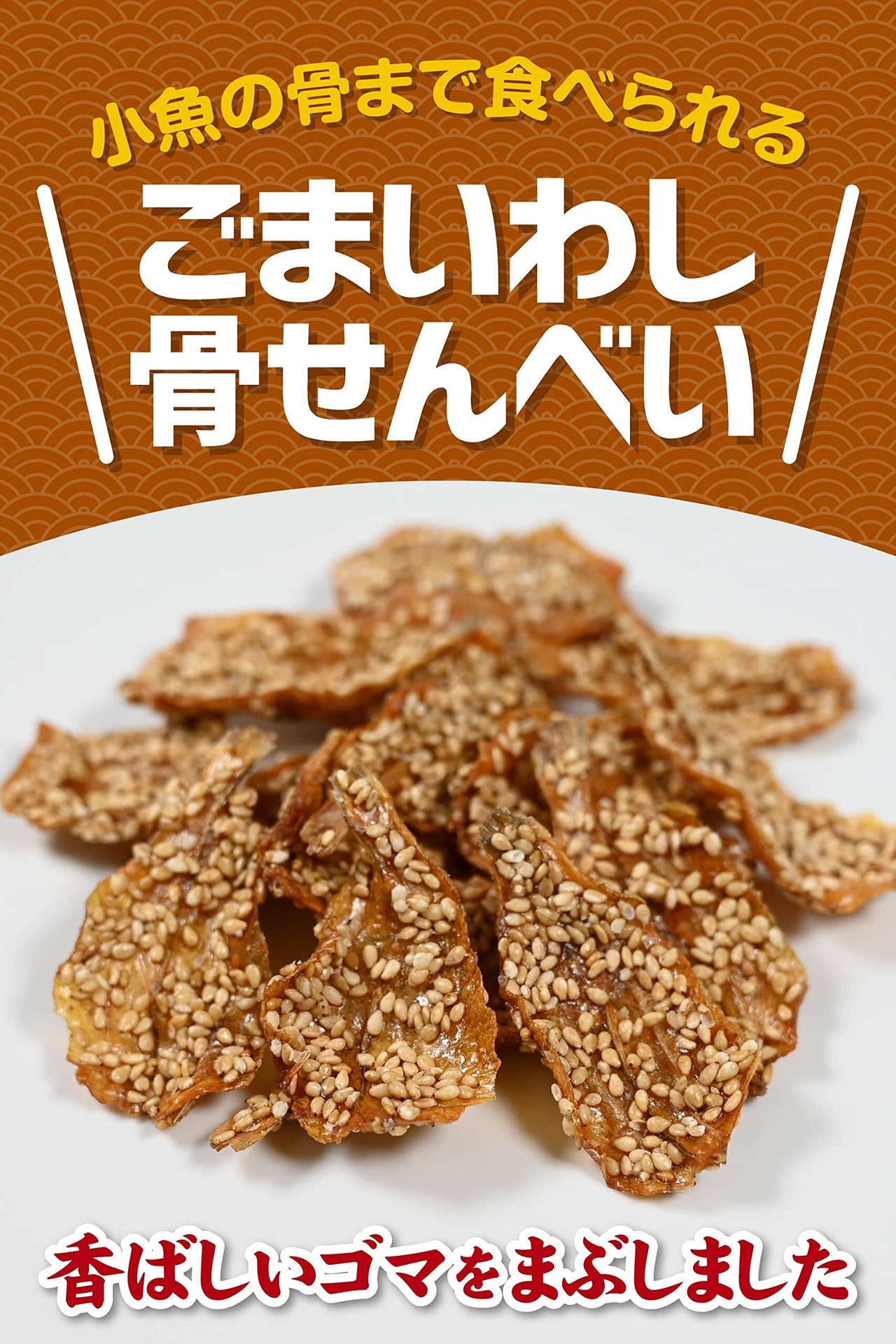 【骨まで食べられる小魚ごませんべい】小魚(いわし)のゴマをまぶした小魚の骨まで食べれらるおやつ・おつまみです。 癖になるサクサクとした食感と、お子様も食べやすい優しく香ばしい味わい。煮干しに代わる栄養補給のおやつとして、小魚の旨味を楽しむおつまみ珍味として、小魚を丸ごとお召し上がりください。