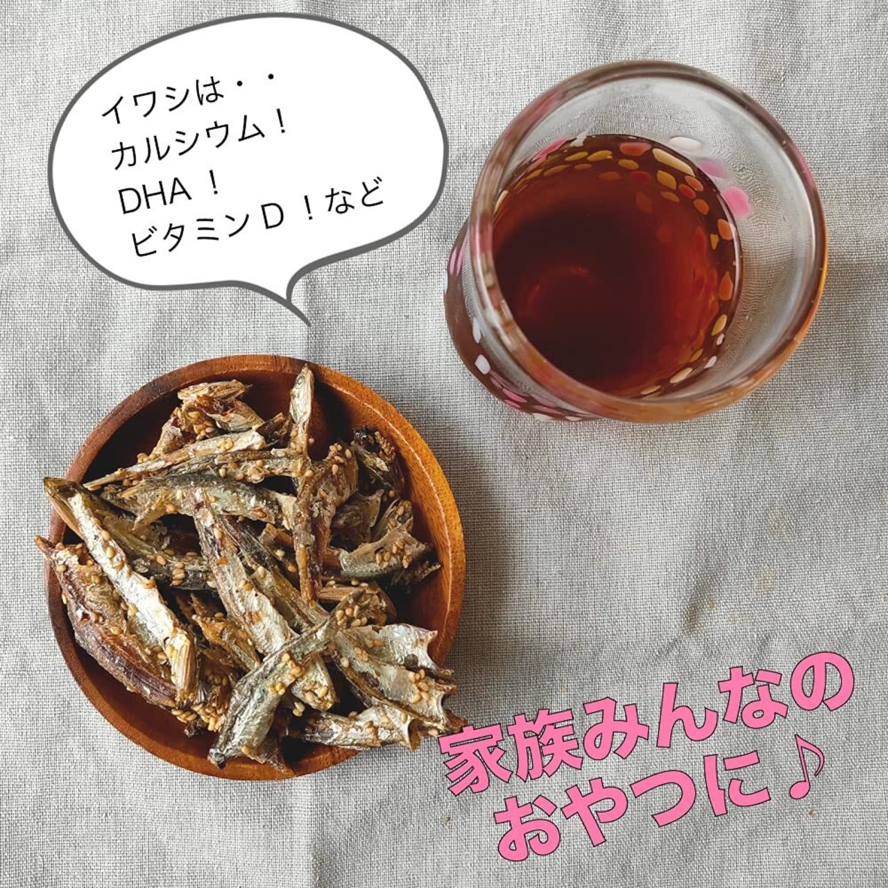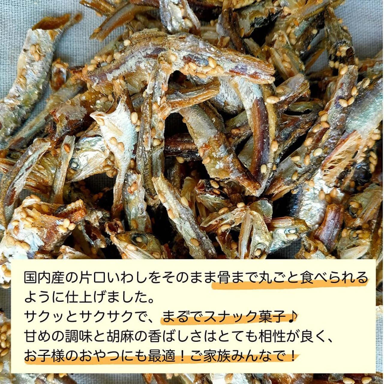 国内産の片口いわしをそのまま骨まで丸ごと食べられるように仕上げました。サクッとサクサクで、まるでスナック菓子のような食感です。甘めの調味と胡麻の香ばしさはとても相性が良く、お子様のおやつにも最適、ご家族皆様でお召上がりいただけます。 ●本品製造工場では、小麦、卵、乳成分、落花生、えび、かにを含む製品を生産しています。●原料の片口いわしは、えび、かにを捕食しています。 ●直射日光、高温多湿を避けて保存してください。 ●開封後は袋の口をしっかり閉じて保管し賞味期限にかかわらずお早くお召し上がりください。
