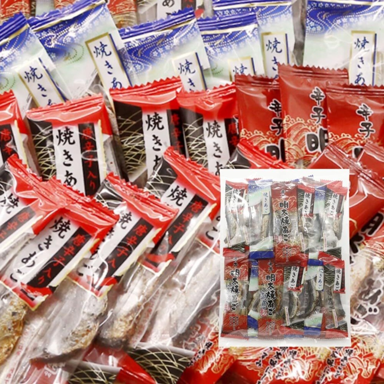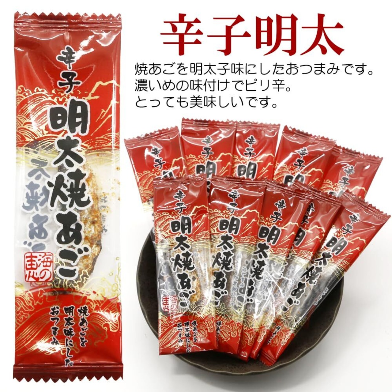 カルシウムたっぷり!丸ごと1尾をパックに!お酒のおつまみにピッタリ!飽きが来ない3種類の味をセットにしました。 プレーン:アゴとは飛魚のことで、甘辛の味付けであごの風味を引き立てています。歯ごたえのある商品です。 唐辛子入り:旨味を引き出す為に、いったん天日干しし、直火で丹念に焼き上げました。唐辛子がピリッと効いています。 明太子入り:焼きあごを明太子にしたおつまみです。濃いめの味付けでピリ辛です。