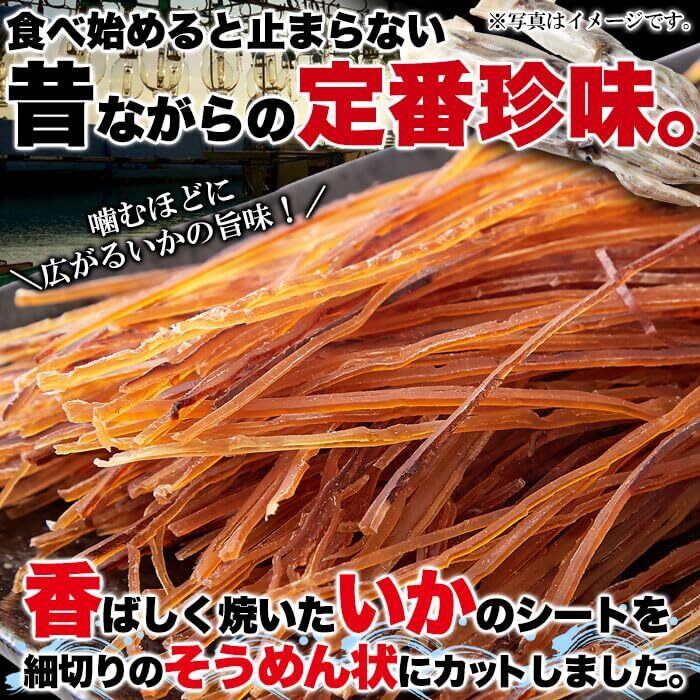 【噛むほどに広がるいかの旨味!!】おつまみの定番!!香ばしく焼いたいかのシートを細切りのそうめん状にカットしました!!コリコリとした食感と噛めば噛むほどじわっと広がるイカの旨味が楽しめます!!