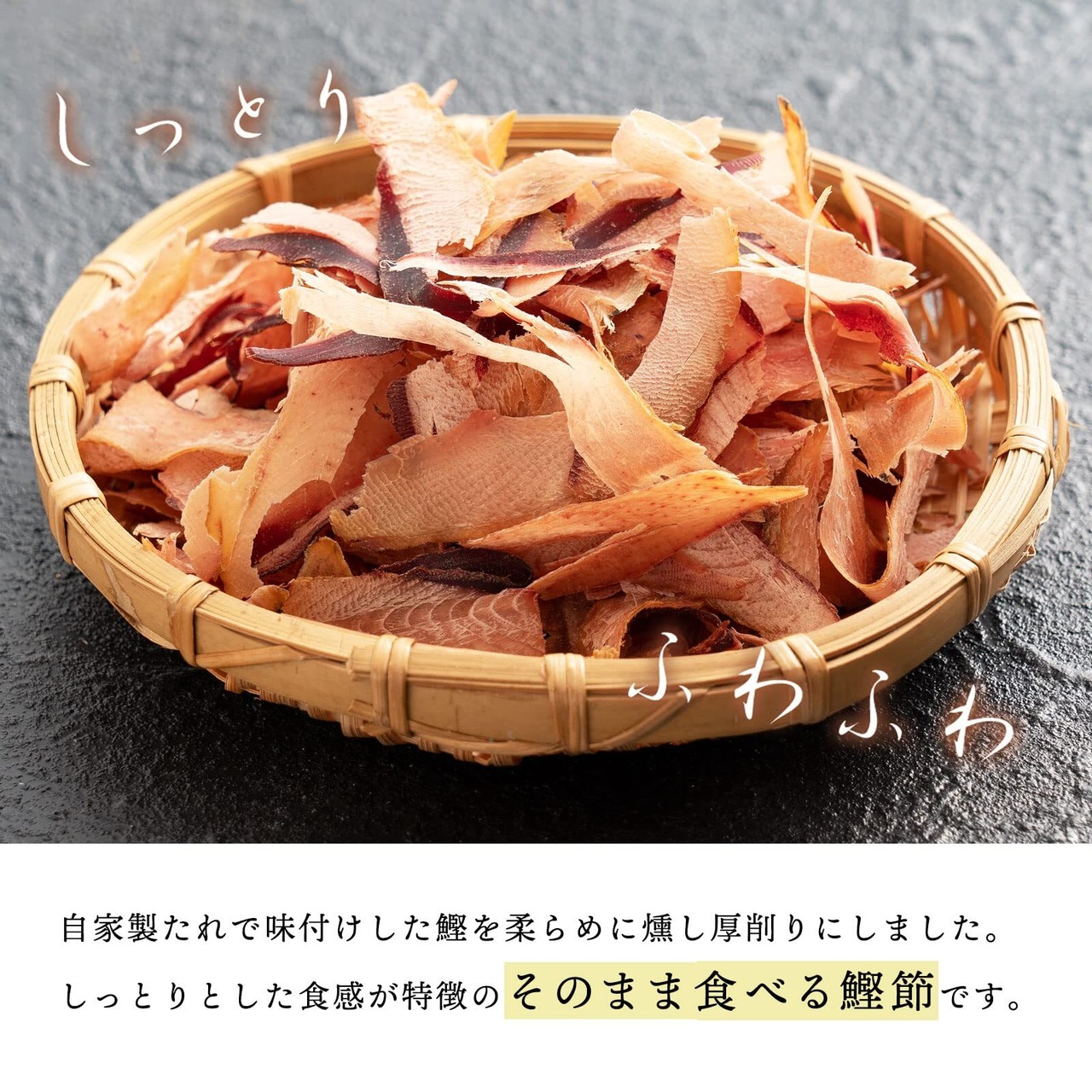 【説明】 自家製たれで味付けした鰹を柔らめに燻し厚削りにしました。 しっとりとした食感が特徴のそのまま食べる鰹節です。 化学調味料・着色料・保存料不使用 ふわふわしっとり食感 素材の味を生かした味付けで、あっさりしているのでついつい手がのびてしまう。 鰹節の良い香りが鼻に抜ける。お酒が進む味!! しっとり半生の鰹節は、まるで生ハムを食べているかのよう。 そのまま食べても美味しいですが、七味マヨネーズにつけたり、 ほかほかのご飯にのっけて醤油をまわしかけるだけでも美味しい! お子様のおやつや、お酒のアテにぴったりですよ!!