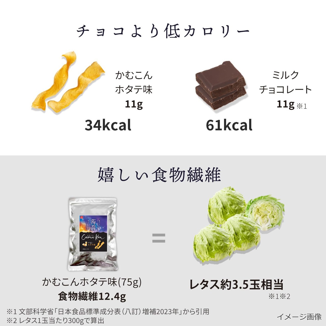 【うれしい食物繊維】「かむこん」は、75gあたり食物繊維がレタス3.5玉分!食物繊維不足の方にも◎(※ホタテ味の場合。レタス1玉当たり300gで算出)