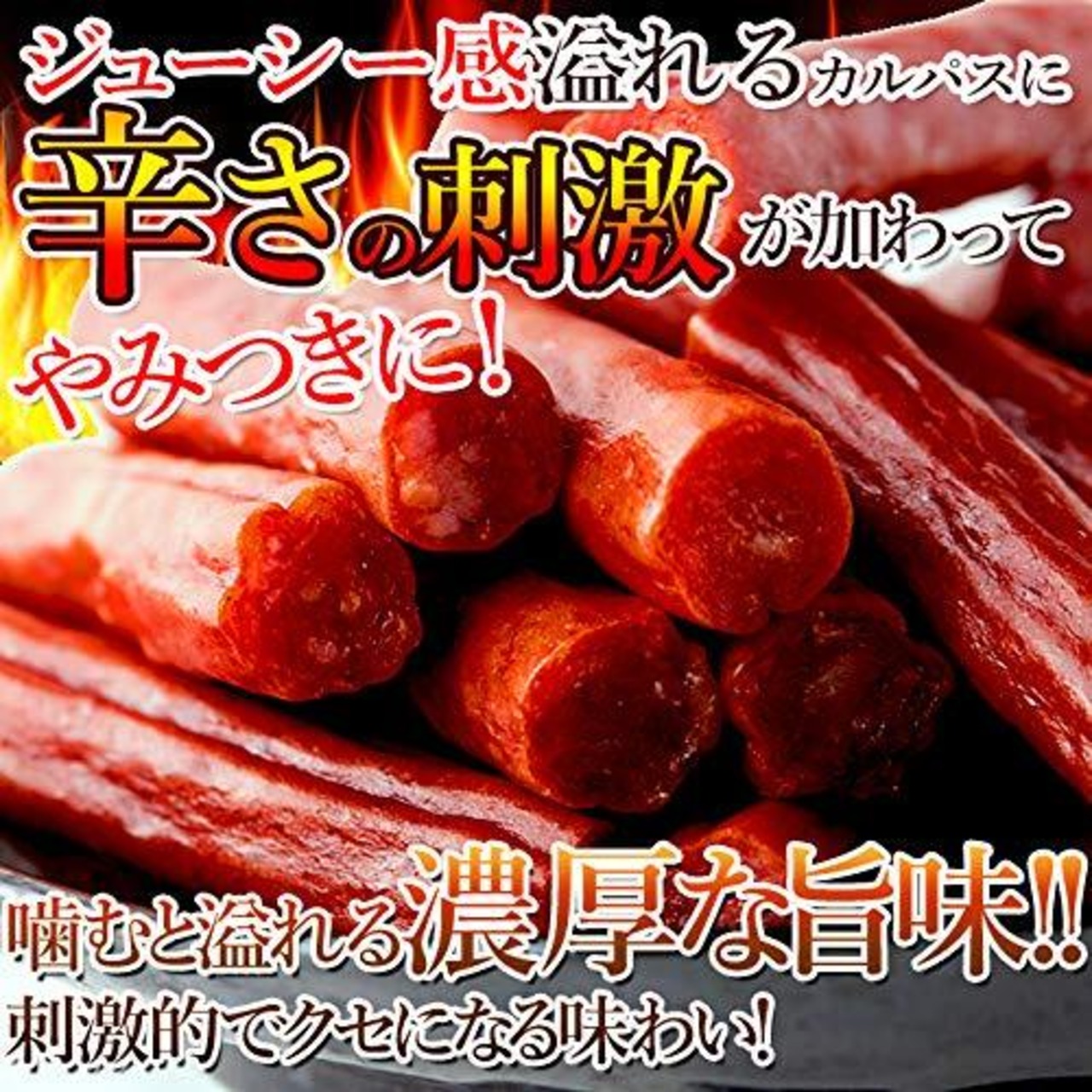 【美味しさの秘密】メインには国産の鶏肉を使用し、豚脂肪を多めに入れ、豚肉、その他調味料などを絶妙に配合することで、旨味(ジューシーさ)がたっぷりで食べ応えのあるカルパスに仕上げました。※本品は非常に辛味の強い商品ですのでお子様や辛みの苦手な方は十分ご注意ください。