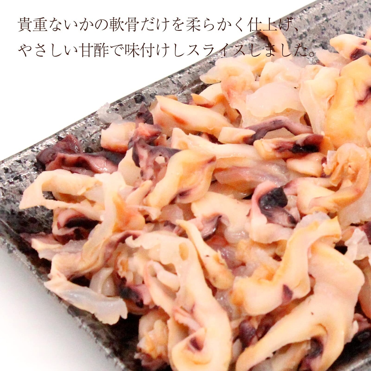 【 函館自慢の逸品 】北海道産するめいかの軟骨を使用し、柔らかく仕上げ、やさしい甘酢で味付けし、スライスしました。爽やかな酸味と軟骨の食感がクセになる逸品です。軟骨は柔らかく仕上げておりますので、女性も食べやすく、お酒のおつまみにぴったりです!【 食感がありながらしっとり柔らか 】コリコリとした食感が特徴的ないかなんこつですが、しっとりと仕上げることで柔らかみもあり、食べやすい軟骨となっています。幅広い方にお召し上がりいただける味付けに仕上げたいかなんこつ。いかの旨味を引き立て、柔らかめで程よい食感がバランスの良い仕上がりとなっています!【 嬉しい食べきりサイズ 】たっぷりと232gのセット品でお届け、116gの食べきりサイズを2袋セットで、常に新鮮な状態で食べられます。2袋セットなので、1つはおつまみに、もう1つはお茶請けにもできます。ビールや焼酎、日本酒の味わいを引き立て、どんどんお酒が進んでしまういかの珍味です。また、ほうじ茶や番茶などのお供に、お茶請けとしてもおすすめです。【 いか軟骨はとても健康的 】いかは低カロリーで低糖質!タンパク質やタウリン、DHAも豊富に含まれています。さらに、いかの軟骨にはコラーゲンもたっぷり含まれている嬉しい食材!美味しく食べながら、健康や美を意識される方にも嬉しい軟骨です。ぜひ、お酒のつまみやご家庭のおやつに、いかなんこつをお召し上がりください。【 安心の函館特産組合品 】原材料:北海道産するめいか 、加工:北海道函館市、内容量:232g(116g×2袋)、保存方法:直射日光、高温多湿を避け常温で保存してください。