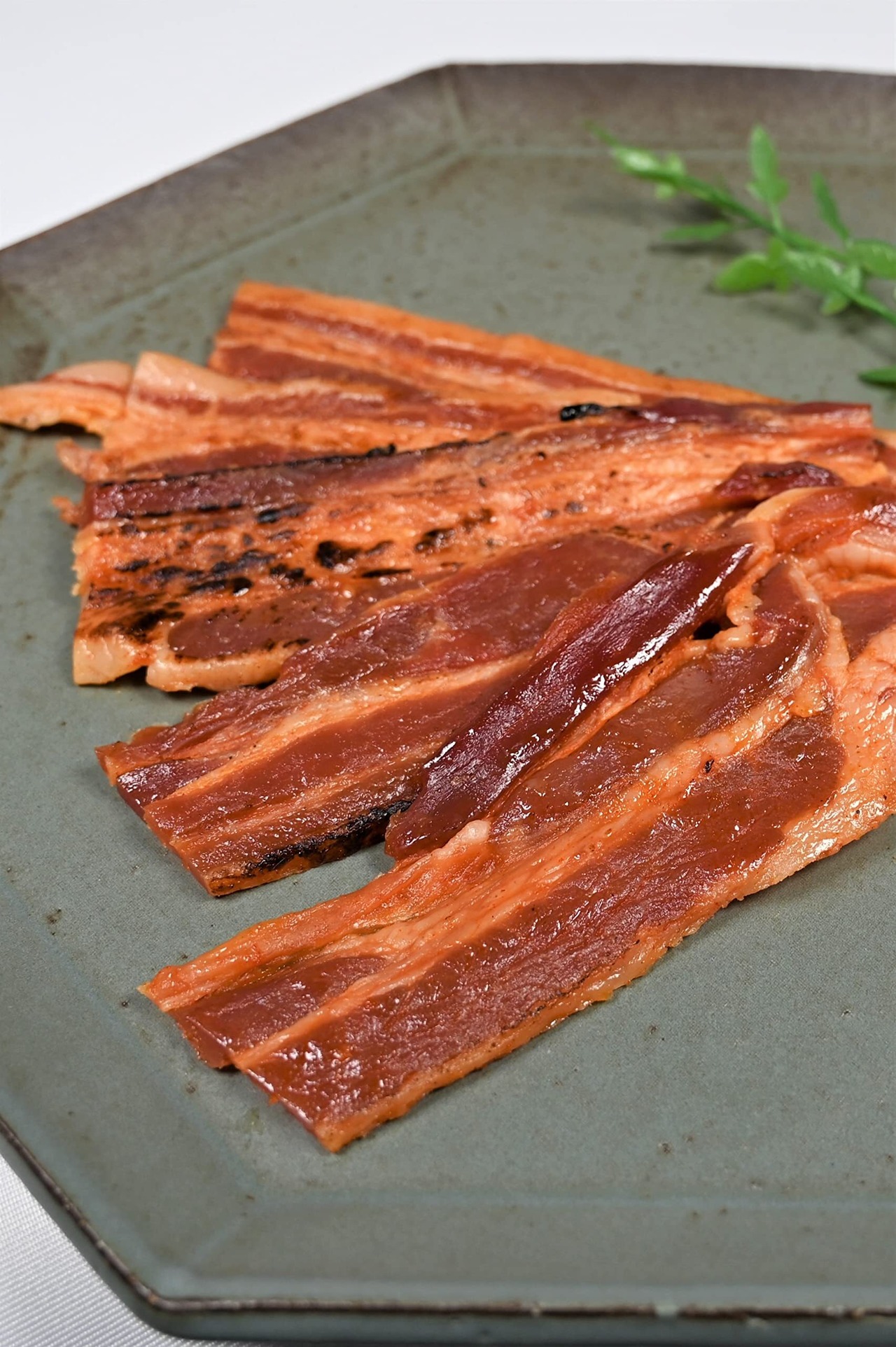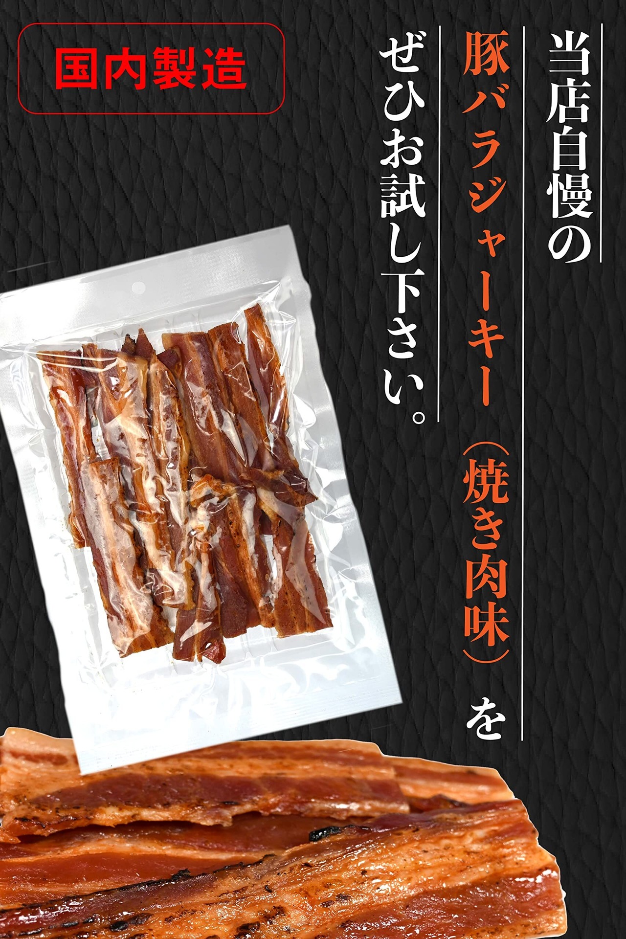 【ピリ辛味が後をひく旨さ】しっかりと付け込まれた醤油ベースのタレはピリ辛味に仕上げています。少し辛みはありますが、豚バラ肉の脂身の甘さとマッチして、美味しい味わいが口いっぱいに広がります。その濃厚な味わいは、ビールや焼酎などお酒のおつまみとしても相性抜群!どんどんお酒が進んでしまう、美味しい豚バラジャーキーです。