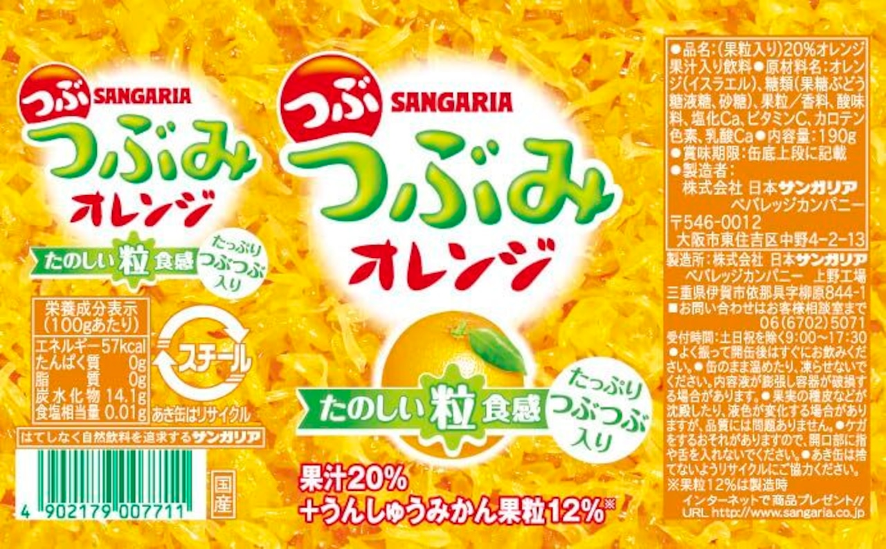原材料:オレンジ(イスラエル)、糖類(果糖ぶどう糖液糖、砂糖)、果粒/香料、酸味料、塩化Ca、ビタミンC、カロテン色素、乳酸Ca