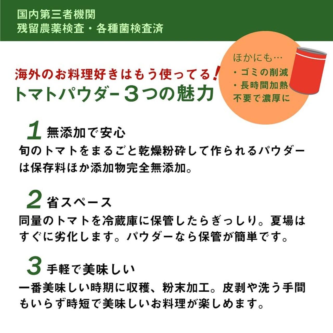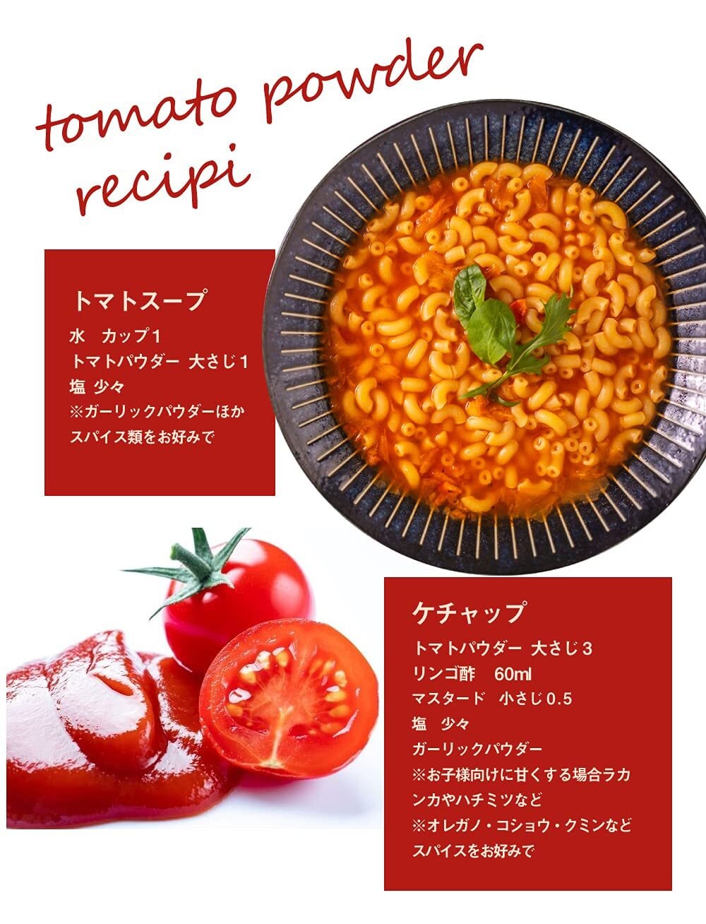 トマトパウダーは、瓶やトマト缶より場所もとらず手軽に使えてとっても便利。