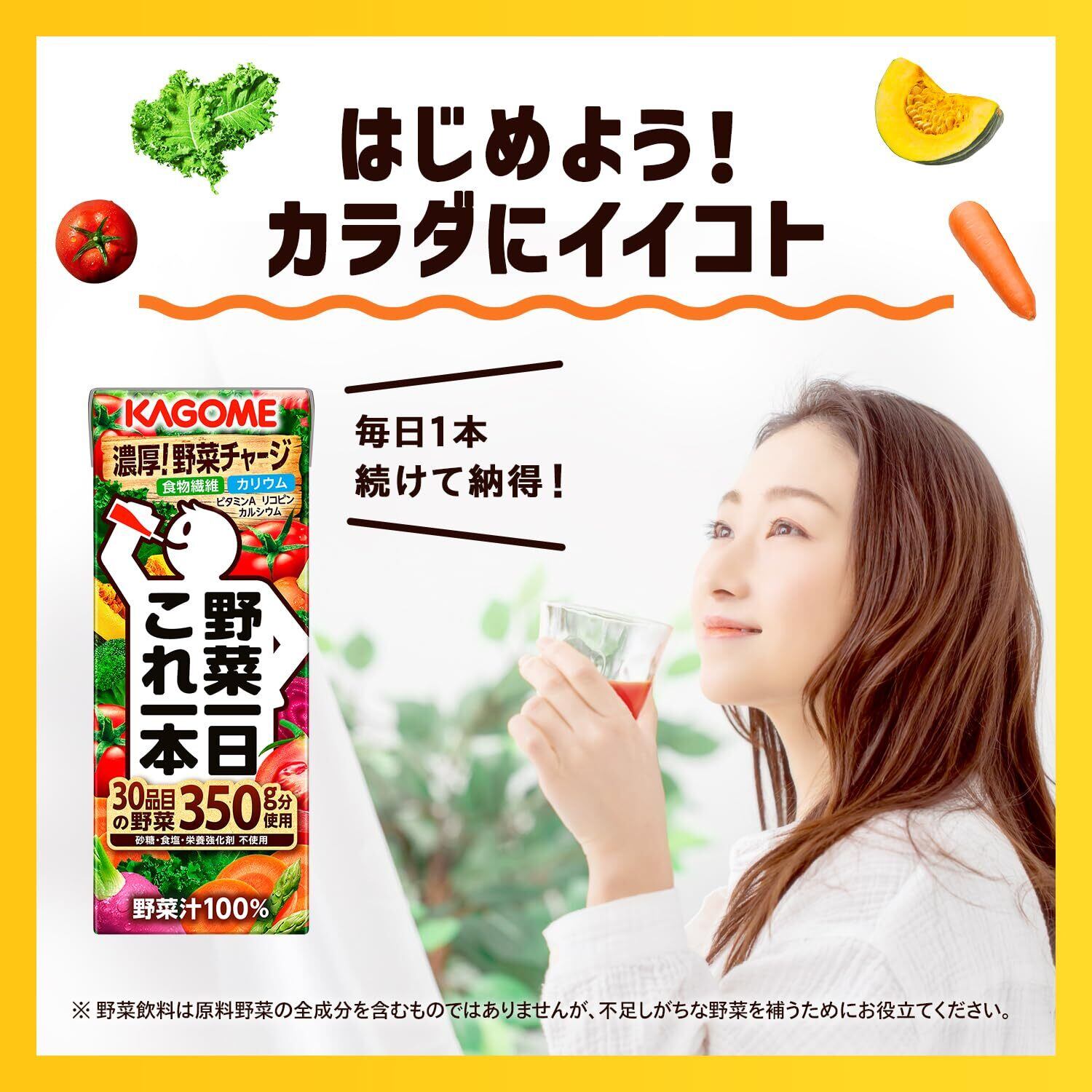 カゴメ 野菜一日これ一本 200ml×30本 フル段ボールは、これ一本」で彩り豊かな30品目の野菜を350g分使用し、香料や栄養強化剤を 使用せずに、野菜由来の栄養※とおいしさを提供する無添加の野菜100%ミックスジュースです。トマトをベ ースに緑野菜をバランスよくブレンドした濃厚な野菜の味わいを楽しみながら、不足しがちな野菜と野菜由来の 栄養※を手軽に補う事ができます。※食物繊維、リコピン、カリウム、カルシウム、ビタミンA 原材料・成分 野菜(トマト(輸入又は国産(5%未満))、にんじん、メキャベツ(プチヴェール)、ケール、ピーマン、ビ ート、ほうれん草、ブロッコリー、あしたば、チンゲンサイ、小松菜、かぼちゃ、パセリ、クレソン、アスパラ ガス、セロリ、しょうが、とうもろこし、ごぼう、グリーンピース、紫いも、キャベツ、レタス、たまねぎ、だ いこん、紫キャベツ、赤じそ、カリフラワー、なす、はくさい)、レモン果汁