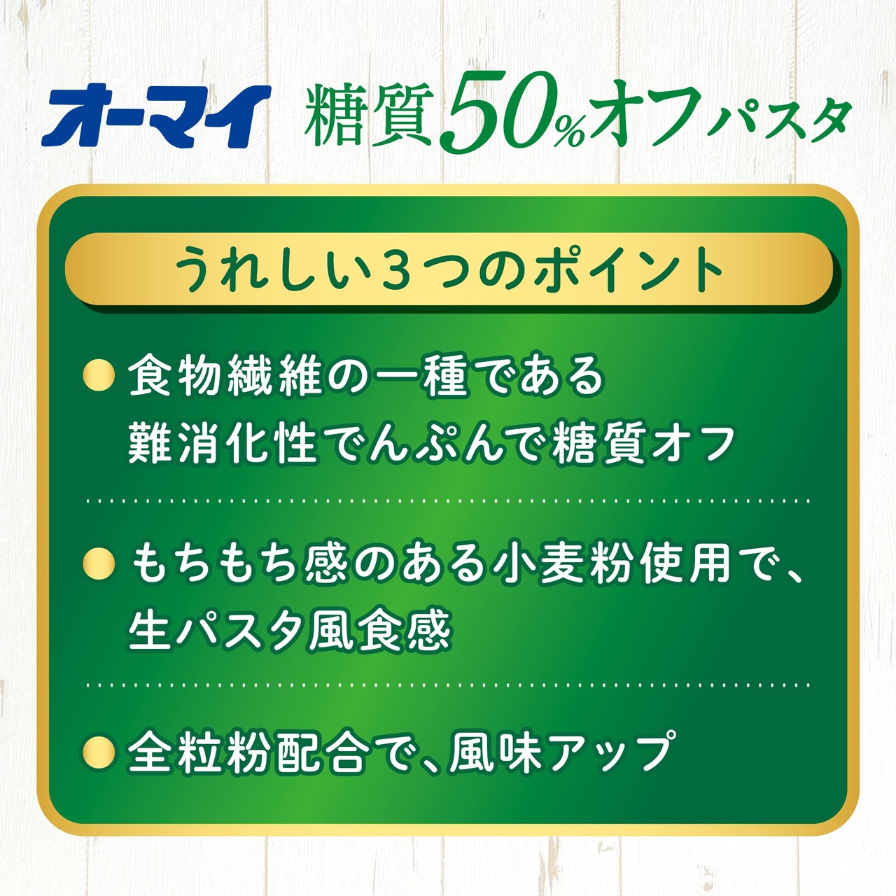 糖質を50%カットしながらも美味しさにこだわったパスタです。 生パスタ風のもちもち食感、全粒粉配合で風味も良く、糖質制限やダイエット中でも、健康的に美味しいパスタを召し上がっていただけます。 1食で1日分の食物繊維も摂取できます。 どんなソースとも相性抜群です!