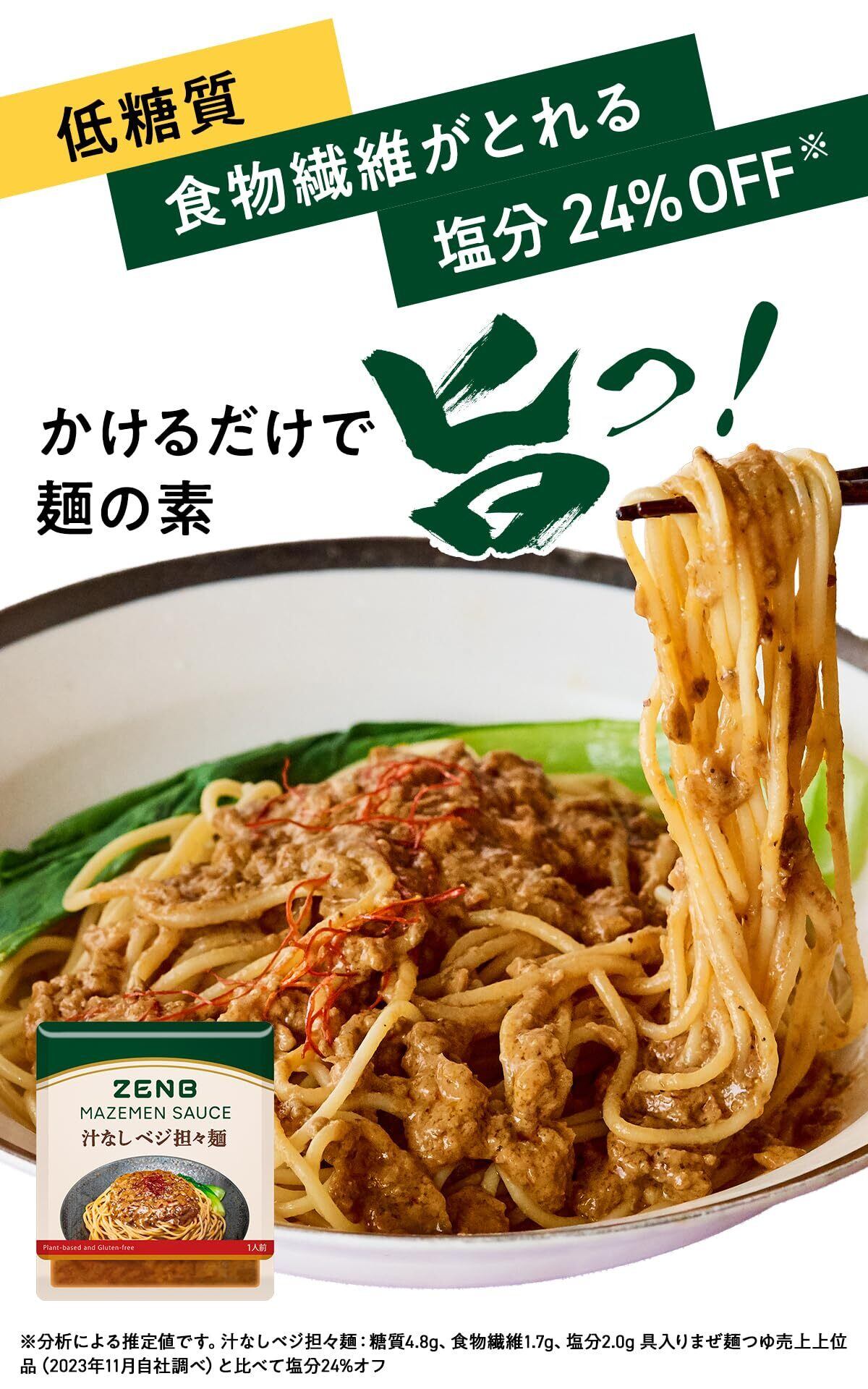 【低糖質の麺の素】 累計販売食数1,800万食を突破した「 ZENBヌードル ( ゼンブヌードル )」と相性抜群の麺の素(麺用ソース)です。低糖質でカラダにやさしい ジャージャー麺の素(麺用ソース) と 担々麵の素(麺用ソース)は、肉などの動物性原料を使わないプラントベースでいつもの まぜ麺の素に比べて塩分24%OFF*。*分析による推定値です。ジャージャー麺:糖質7.6g、食物繊維1.6g、塩分2g 汁なし担々麺:糖質4.8g、食物繊維1.7g、塩分2g 具入りまぜ麺つゆ売上上位品(2023年11月自社調べ)と比べて塩分24%オフ。