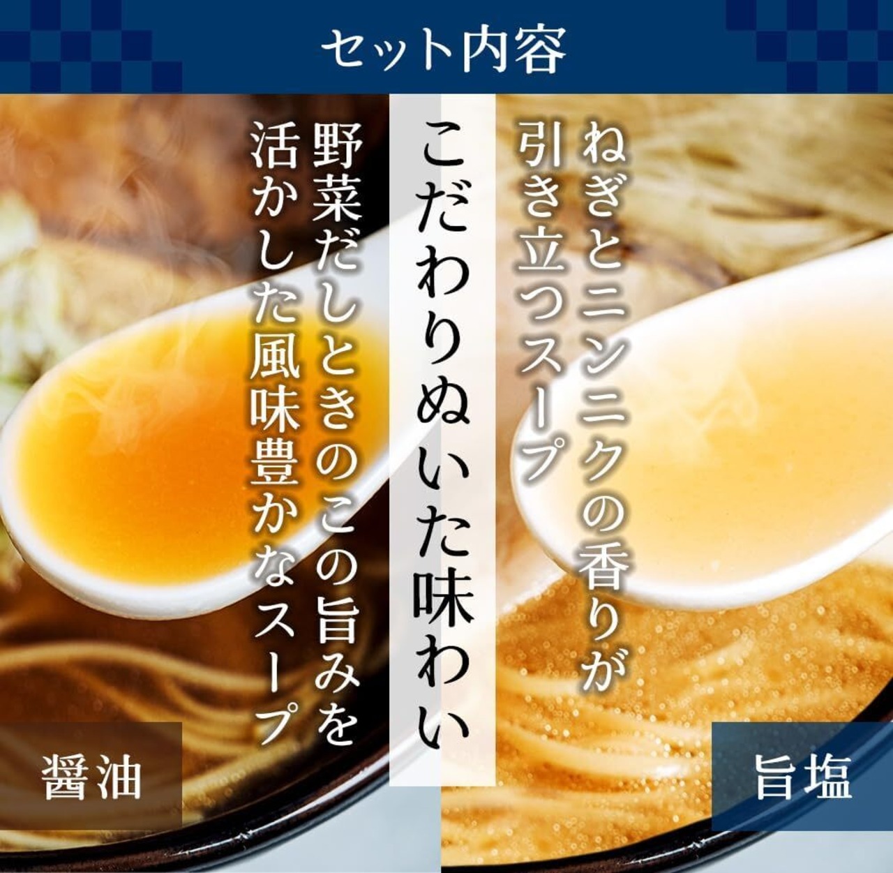 全2種類の味わい➀醤油、②旨塩 醤油:焦がし醤油を使用した、満足感のある醤油ラーメン。6種類の野菜やきのこの旨みをぎゅっと濃縮し、香り高い焦がし醤油と合わせたこだわりのスープです。隠し味にしょうがを加え、満足感がありつつも、さっぱりとした味わいです。旨塩:香味野菜をたっぷり使った、コク深い味わいの旨塩ラーメン。昆布だしをベースに、じっくり炒めた玉ねぎやニンニクなどの香味野菜を合わせた、しっかりしたコクと旨みが味わえるスープです。隠し味にまいたけを加え、満足感ある味わいです。