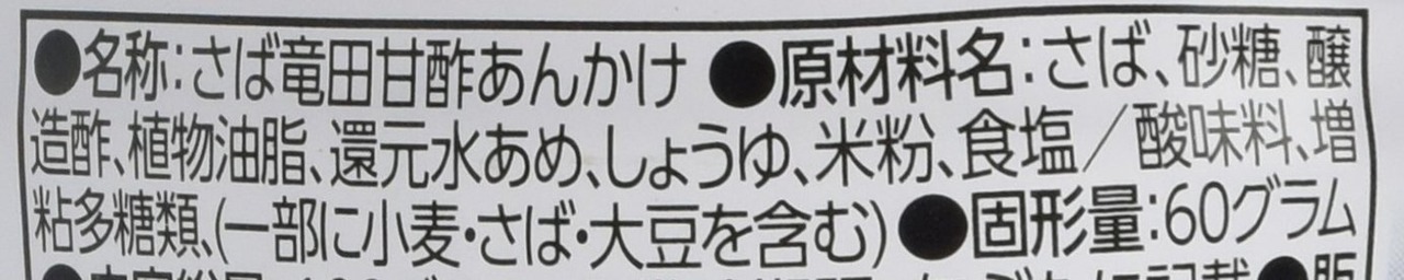 原材料:さば、砂糖、醸造酢、植物油脂、還元水あめ、しょうゆ、米粉、食塩/酸味料、増粘多糖類、(一部に小麦・さば・大豆を含む)