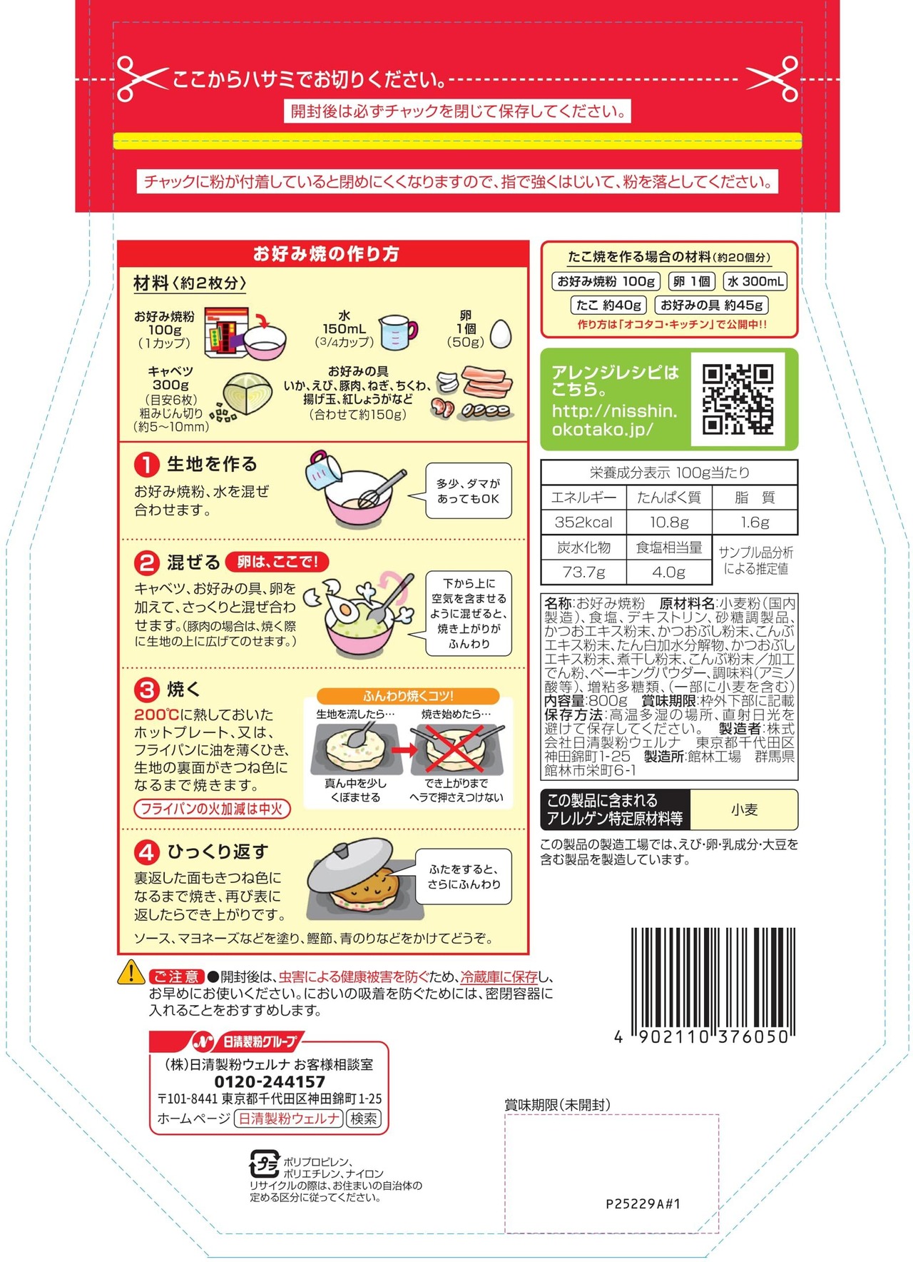 ロングセラーの「日清 お好み焼粉」のたっぷり作れる800g(約16枚分)タイプです。
