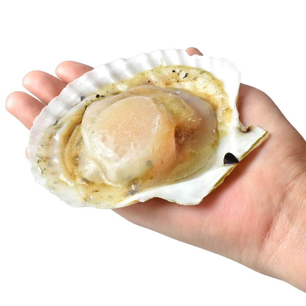 【片貝(ハーフシェル)】ホタテ貝の殻を半分取り除いています。グリル 網 フライパン にそのまま乗せて加熱することができる上、受け皿となった殻が溢れる旨味を逃さないので醤油 バターなどシンプルな調理でも美味しく召し上がって頂けます。