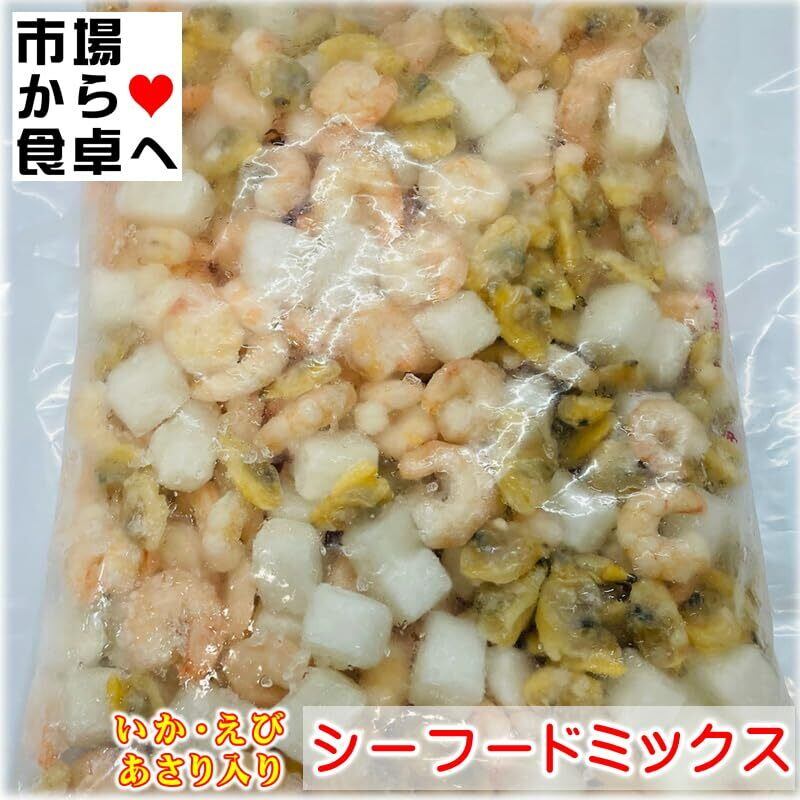 シーフードミックス ・800g【便利なIQFバラ凍結】割合(いか40%えび35%あさり25%)あんかけ、シチュー、カレー、かき揚げ、炒め物などいろいろ使えます【冷凍便】 うまいもの市場が販売いたします。 IQF、便利なバラ凍結。 あんかけ、シチュー、カレー、かき揚げ、炒め物などいろいろな料理にお使いいただけます。