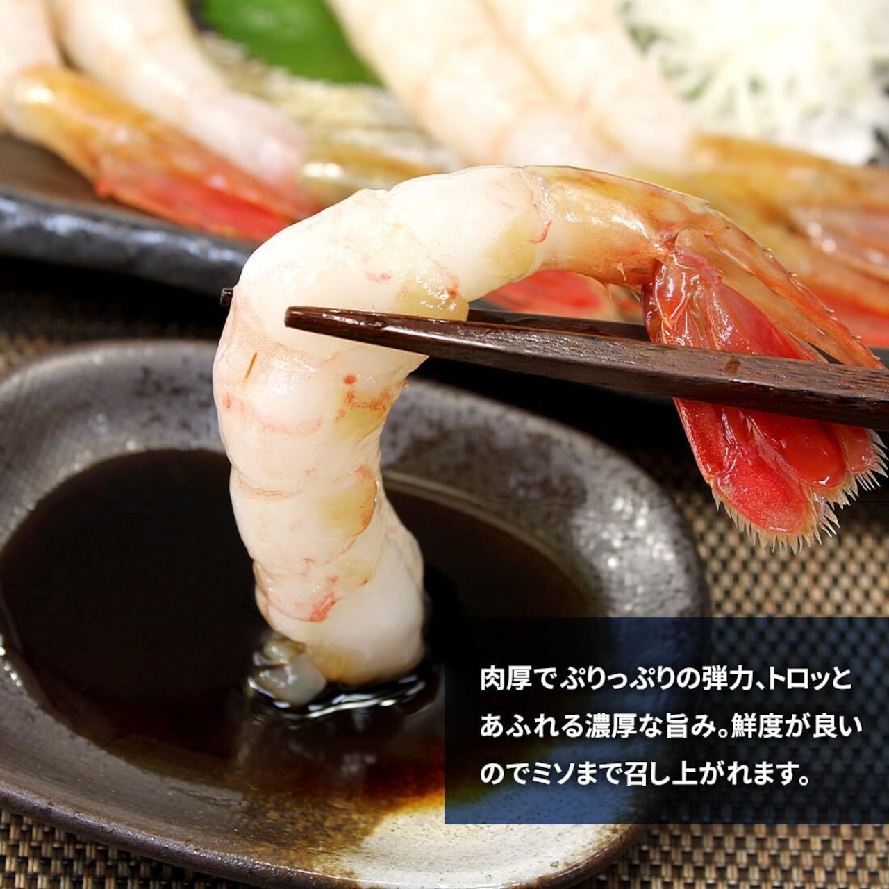 肉厚でぷりっぷり、甘みたっぷり!濃厚な舌触りとトロッとあふれる旨みが絶品。手からはみ出すほどの大きさ、殻を剥いても身は極太、希少な特大サイズです。獲れたてを船上で急速冷凍した鮮度抜群の品ですので、ぜひお刺身でお召し上がりください。もちろん味噌まで召し上がれます。