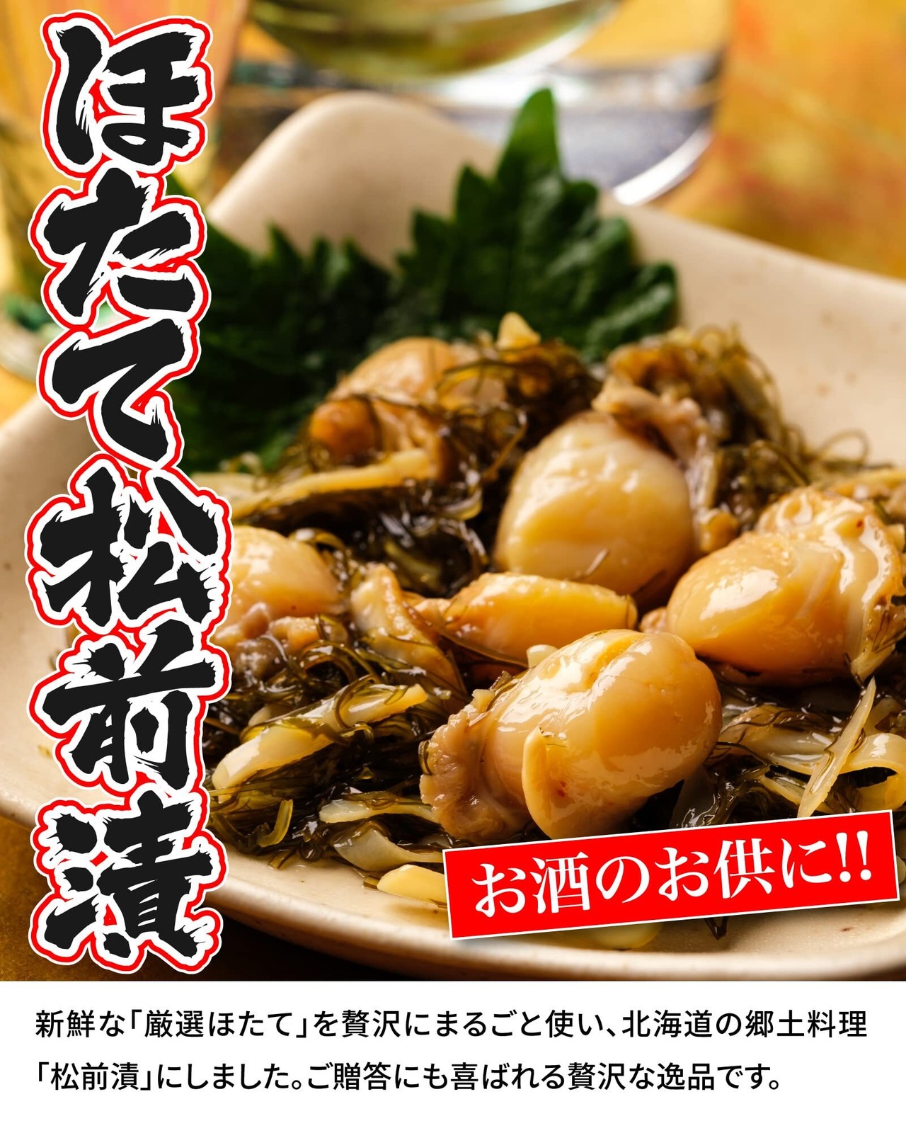 道水オリジナルほたて松前漬。厳選ほたてをたっぷり90%使用した味わい深い贅沢な松前漬。ほたての旨味をしっかり閉じ込めるためにボイル処理を工夫して丁寧に仕上げました。さらに、するめと昆布の味わいがたっぷり染み込む贅沢な一品です。お正月のめでたい席にもピッタリな料理、おせちの一品としてそのまま使えて便利です。