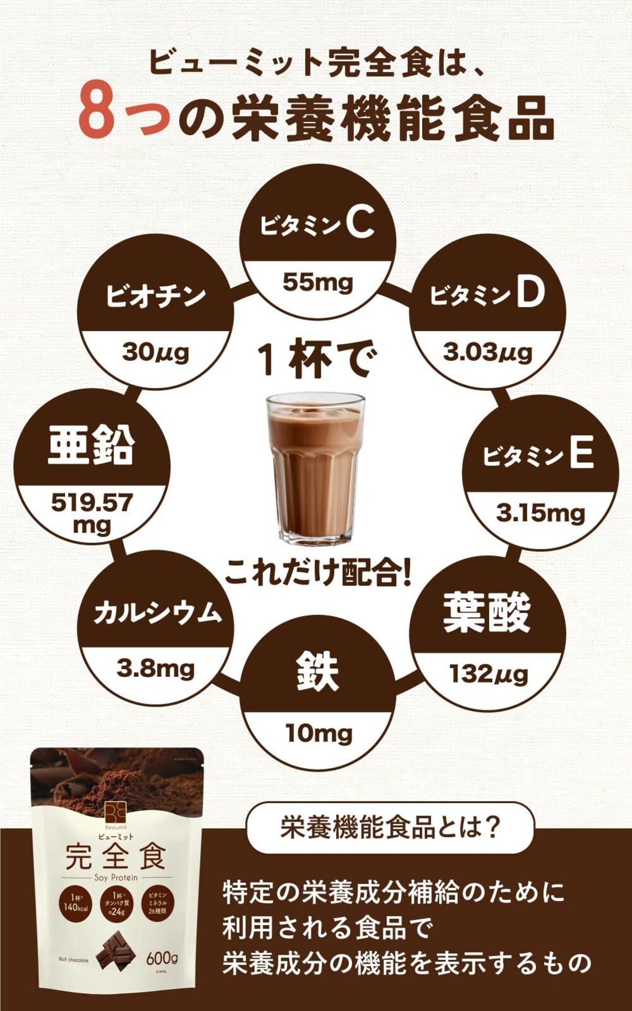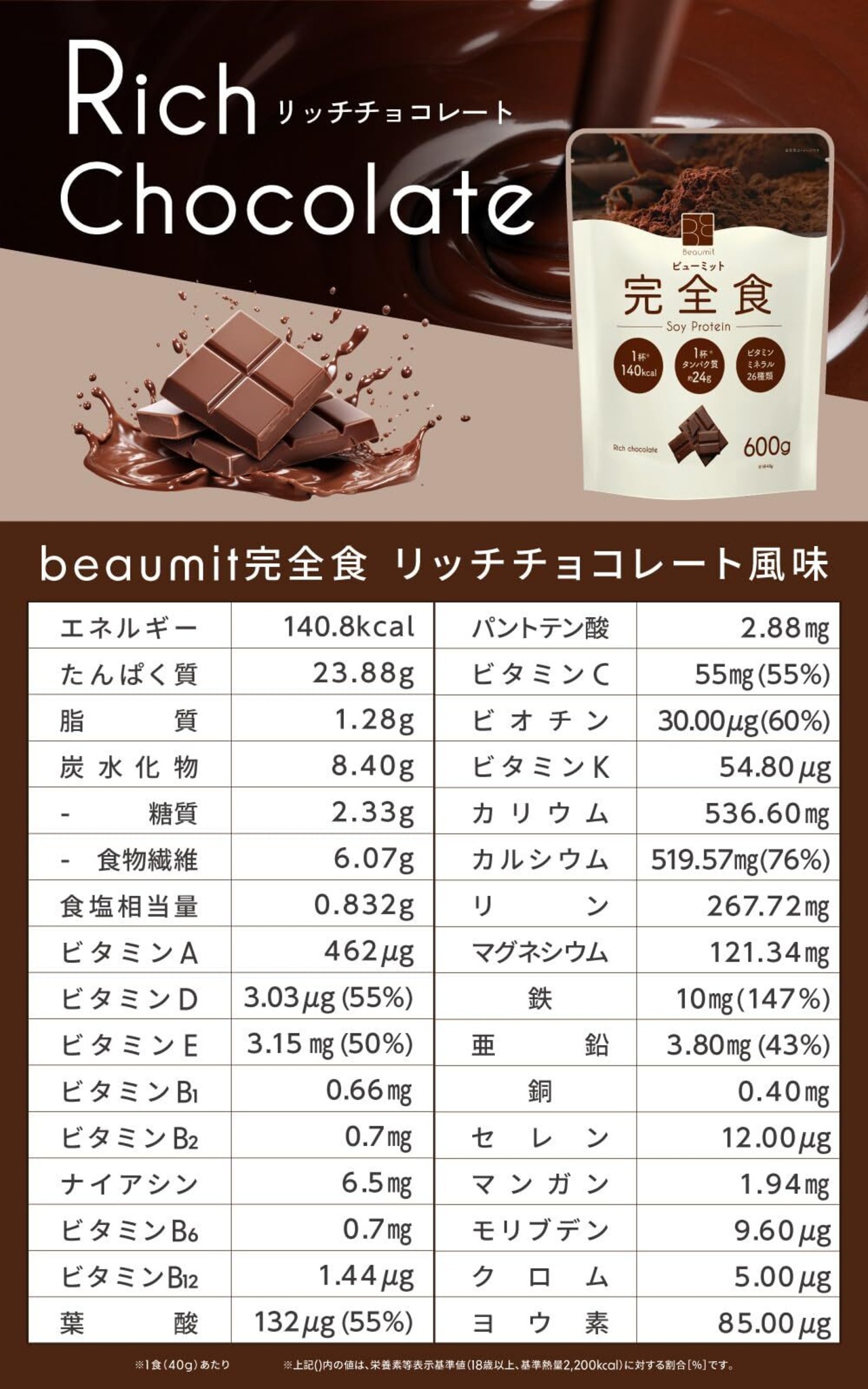 Beaumit 完全食 ソイプロテイン600g 完全栄養食 たんぱく質24g ダイエット 置き換えダイエット チョコレート味 国際中医師監修 人工甘味料不使用 140kcal 栄養機能食品 国内製造 ビタミン13種類 ミネラル12種類