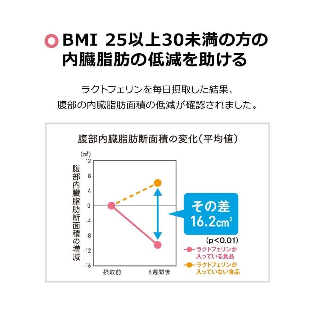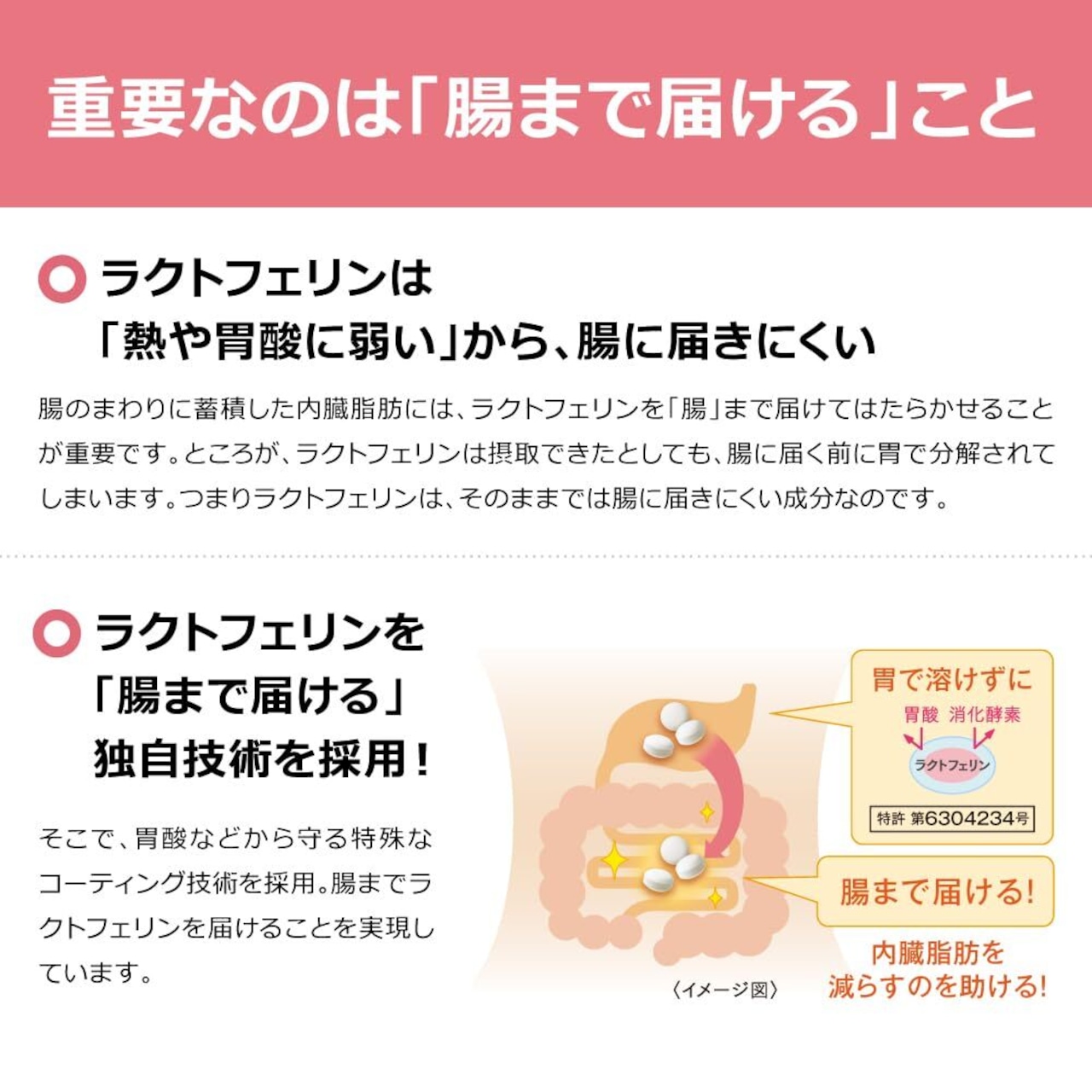 【届出番号】I703 【届出表示】本品にはラクトフェリンが含まれるので、肥満気味な方の内臓脂肪を減らすのを助け、高めの BMIの改善に役立ちます。 【機能性表示食品についてのご注意】 本品は、事業者の責任において特定の保健の目的が期待できる旨を表示するものとして、消費者庁長官に届出されたものです。ただし、特定保健用食品と異なり、消費者庁長官による個別審査を受けたものではありません。