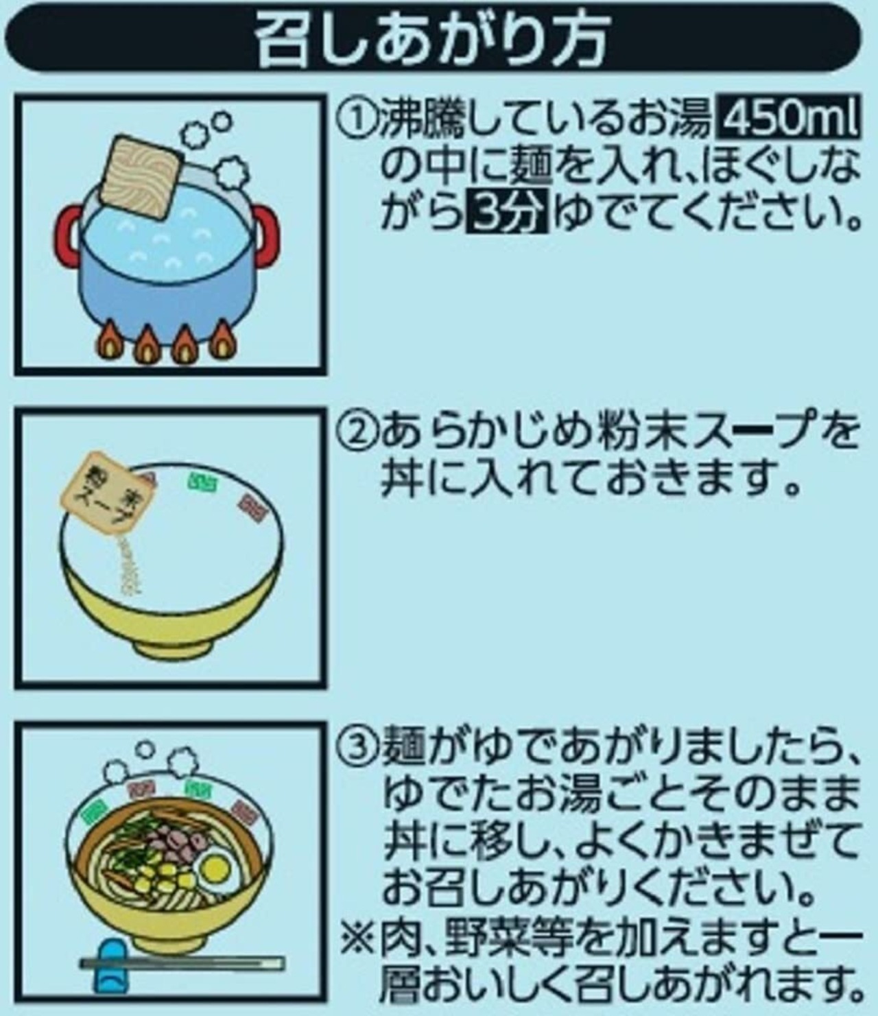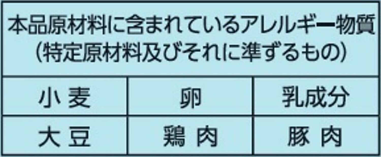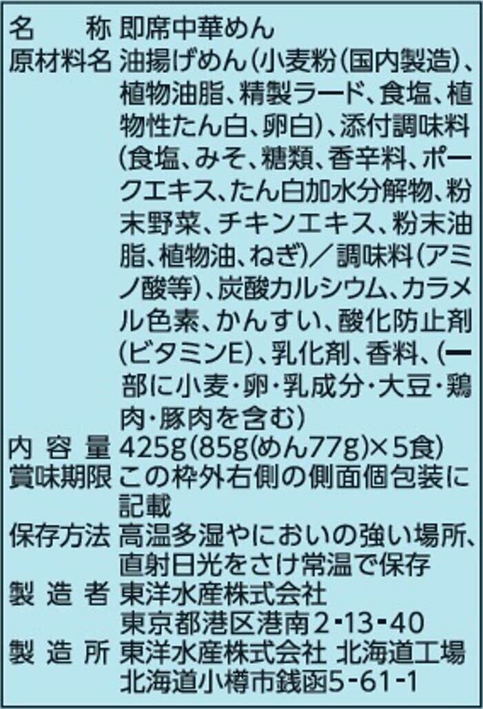 油揚げめん(小麦粉(国内製造)、植物油脂、精製ラード、食塩、植物性たん白、卵白)、添付調味料(食塩、みそ、糖類、香辛料、ポークエキス、たん白加水分解物、粉末野菜、チキンエキス、粉末油脂、植物油、ねぎ)/調味料(アミノ酸等)、炭酸カルシウム、カラメル色素、かんすい、酸化防止剤(ビタミンE)、乳化剤、香料、(一部に小麦・卵・乳成分・大豆・鶏肉・豚肉を含む)