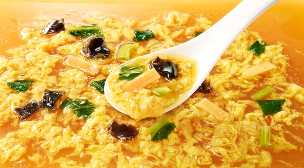 具材は、国産たまごを使用したかきたま、たけのこ、チンゲン菜、きくらげ、ごまです。