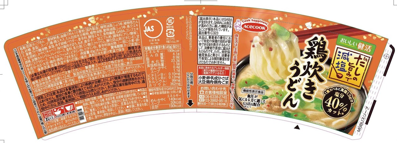 1食(45g)当たり:エネルギー190kcal、タンパク質4.1g、脂質8.9g、炭水化物23.3g、食塩相当量1.5g