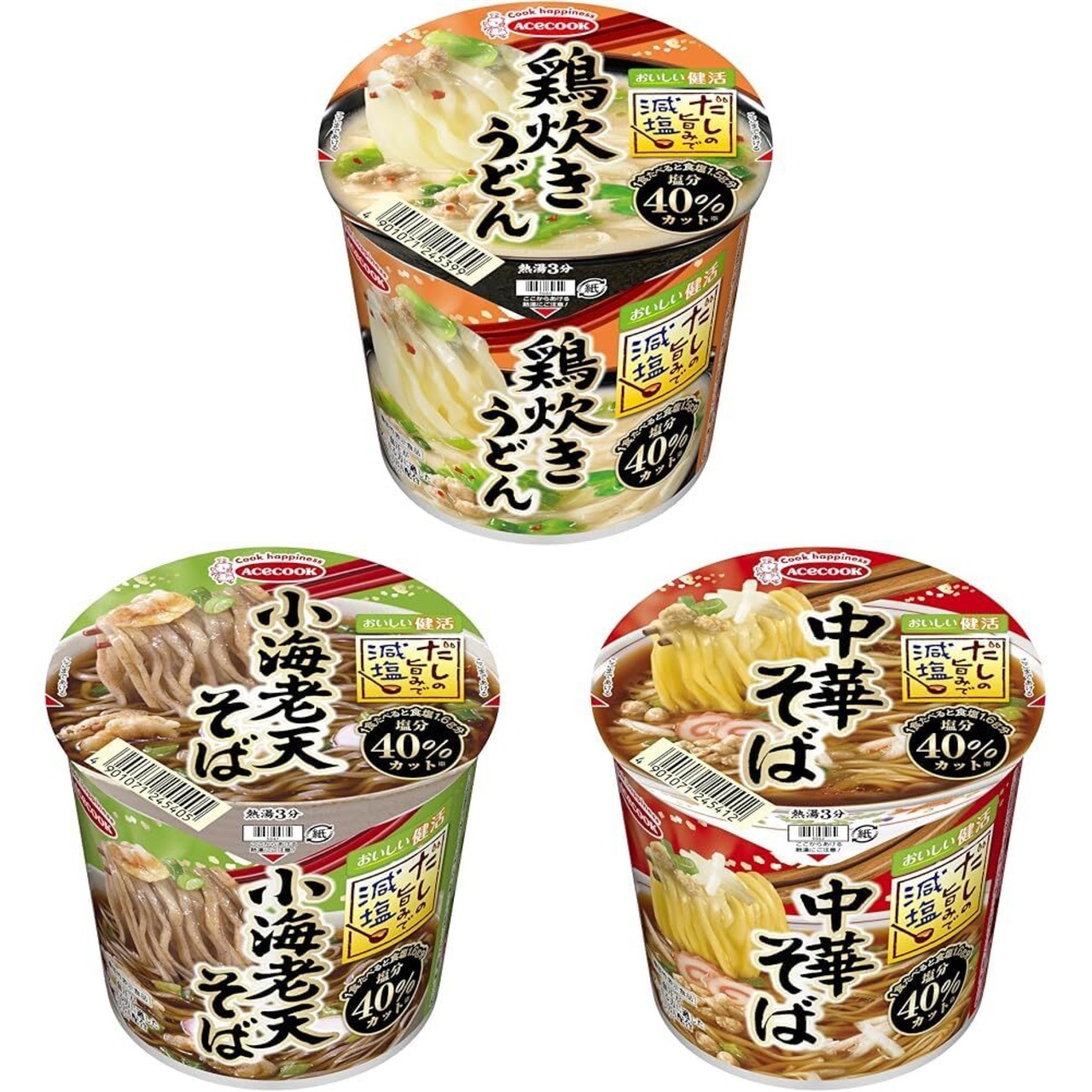 【セット買い】エースコック だしの旨みで減塩 鶏炊きうどん 45g×12個 + エースコック だしの旨みで減塩 小海老天そば 42g×12個 + エースコック だしの旨みで減塩 中華そば 43g×12個
