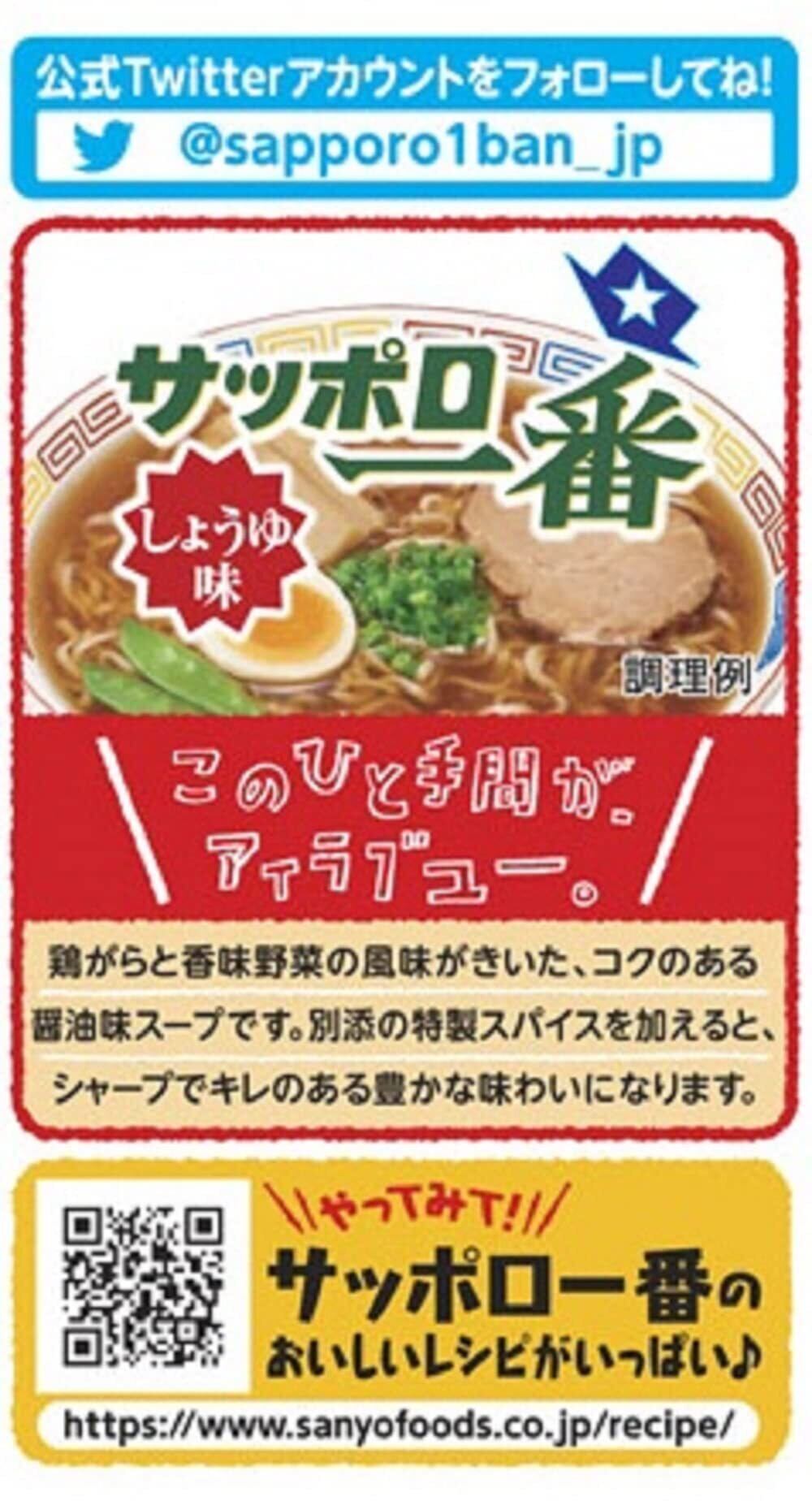 原材料:油揚げめん(小麦粉、ラード、植物油脂、でん粉、しょうゆ、食塩)、スープ(食塩、糖類、しょうゆ、香辛料、ねぎ、チキンエキス、植物油脂)、やくみ(香辛料)、調味料(アミノ酸等)、炭酸カルシウム、カラメル色素、増粘多糖類、かんすい、酸化防止剤(ビタミンE)、酸味料、ビタミンB2、 ビタミンB1、(原材料の一部にごま、豚肉を含む)